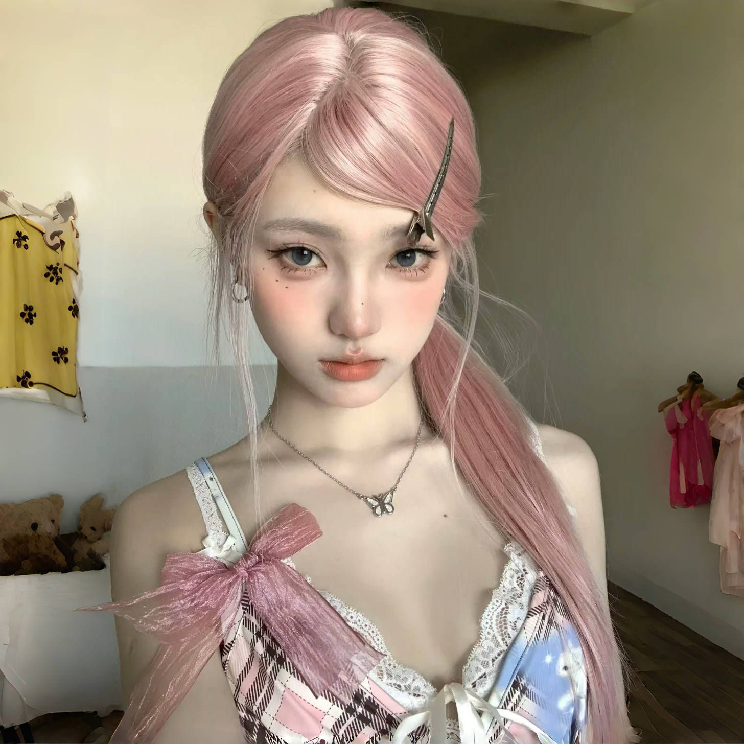 女团粉金小额蕾丝粉色长直发层次感假发女全头套假发