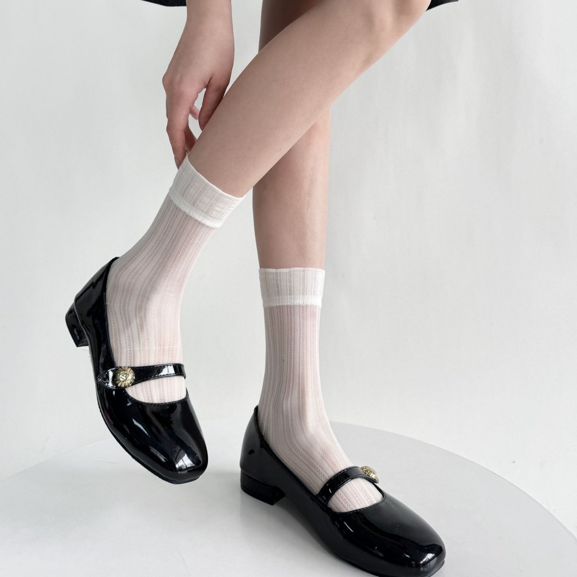 夏季薄款微透网眼透气中筒袜奶白色日系百搭少女短袜黑色简约女袜