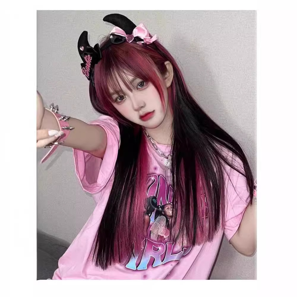 假发女长直发黑红粉彩色渐变千禧挑染Y2K辣妹lolita潮酷全头套