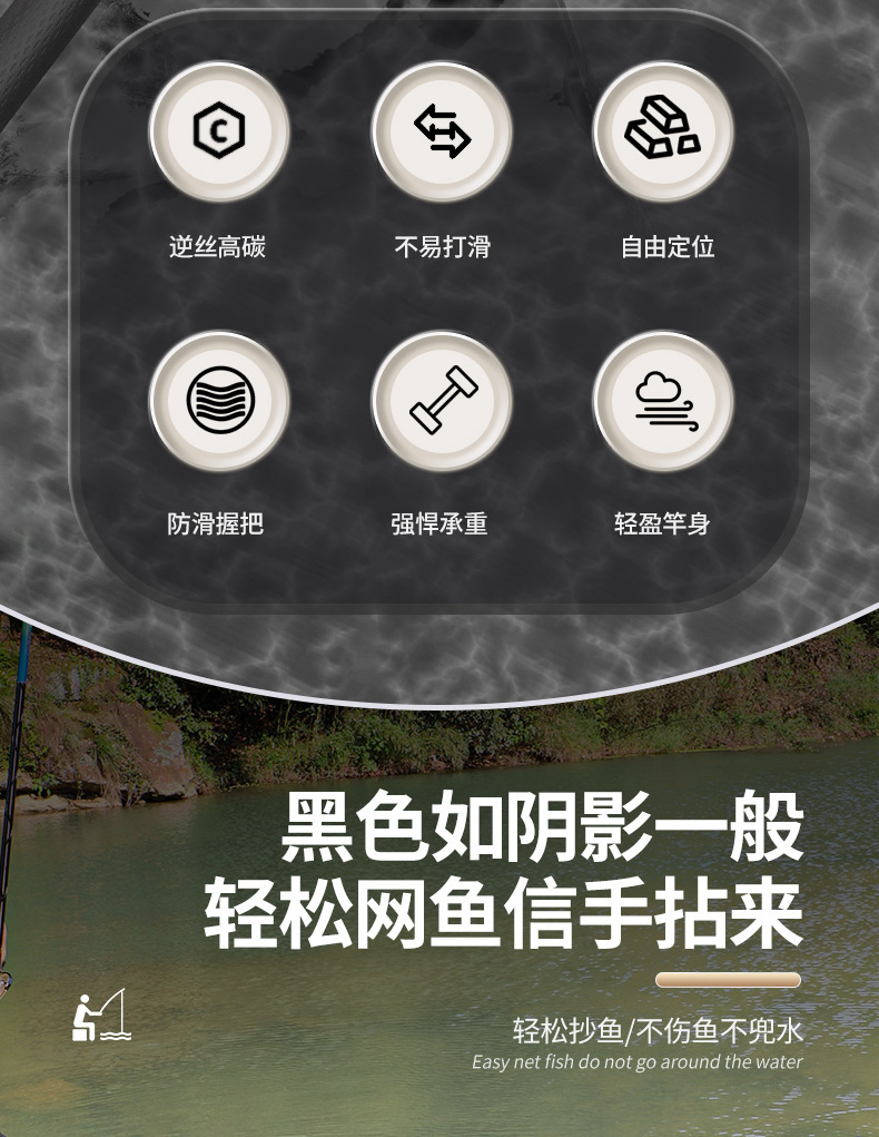 一体成型碳钛黑金抄网头蜂窝纳米速干防挂网黑坑竞技飞抄网头