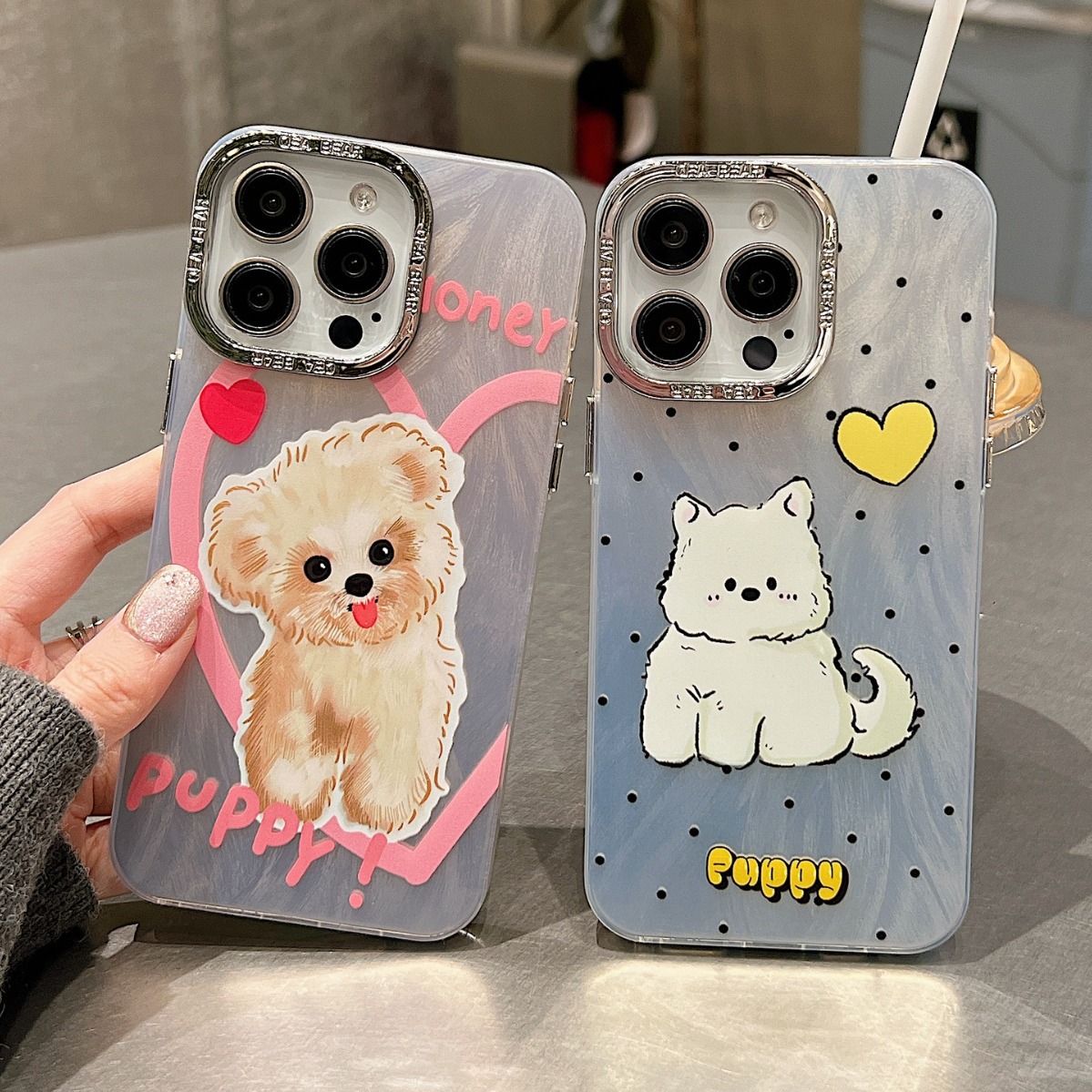 卡通ins爱心吐舌小狗适用15ProMax手机壳防摔14pro苹果13电镀镜框