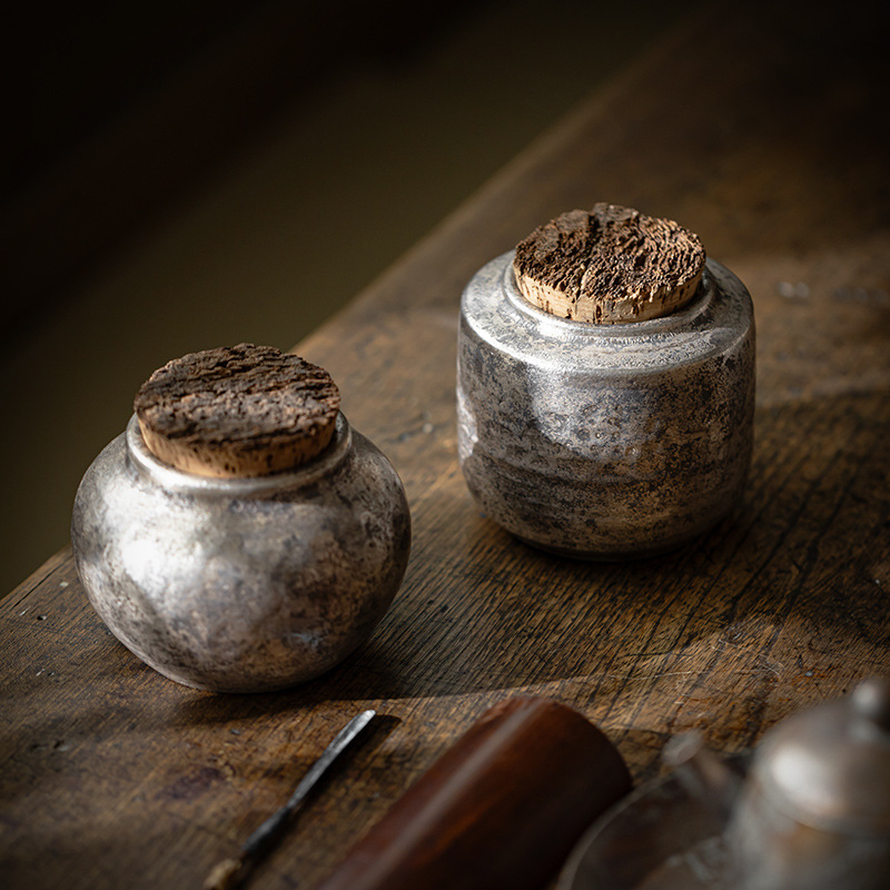 鎏银烧银箔粗陶木塞小号茶叶罐密封防潮罐子家用小容量存茶罐