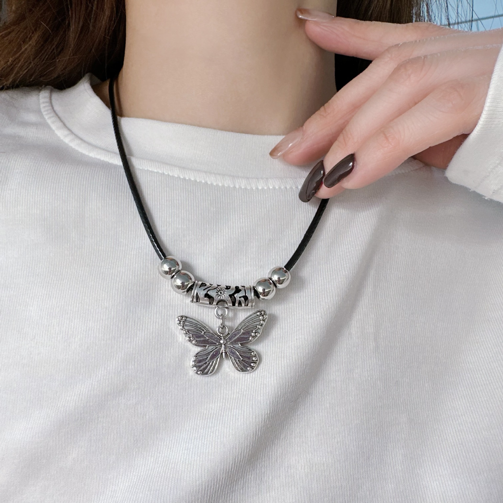 新中式复古民族风串珠古银蝴蝶油蜡皮绳项链饰品女锁骨链