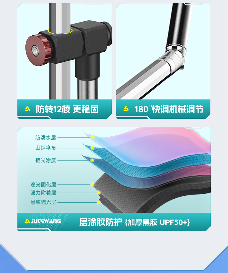- 【双360调节加硬不锈钢零透光防暴雨】牛津布黑胶2.2米蓝黑