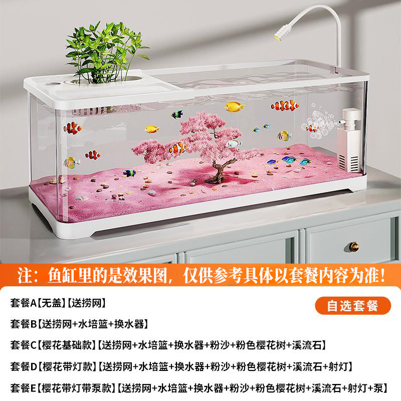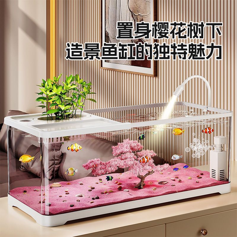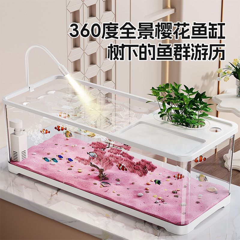小型水族箱客厅樱花造景鱼缸全套生态桌面养鱼缸办公室带盖乌龟缸