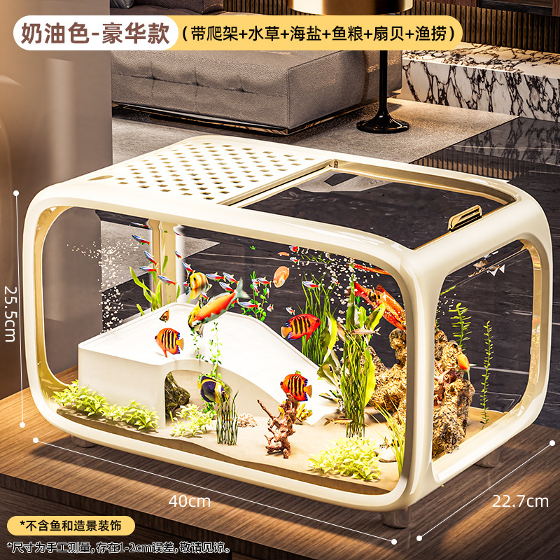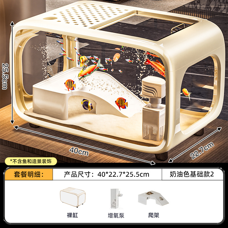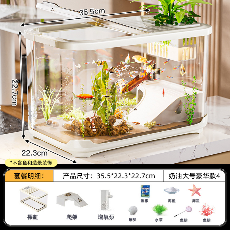 - 【奶油色-豪华款+增氧泵】带爬架+水草+海盐+鱼粮+扇贝+渔捞