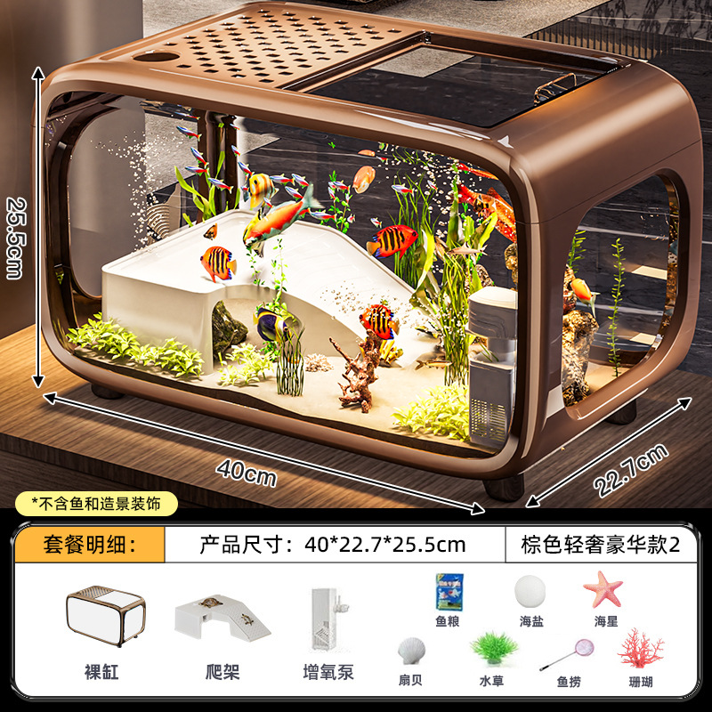 - 【棕色-豪华款+增氧泵】带爬架+水草+海盐+鱼粮+扇贝+渔捞