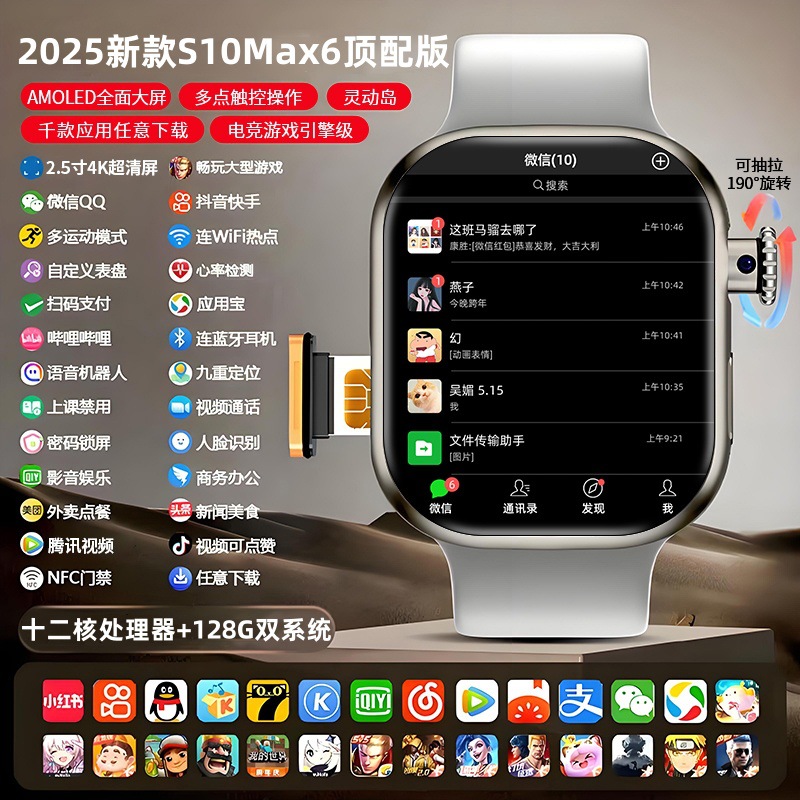 - 顶配S10Max6银✅2.5寸4K超清AMOLED屏+190°旋转摄像+任意应用下载+微Q抖+双系统