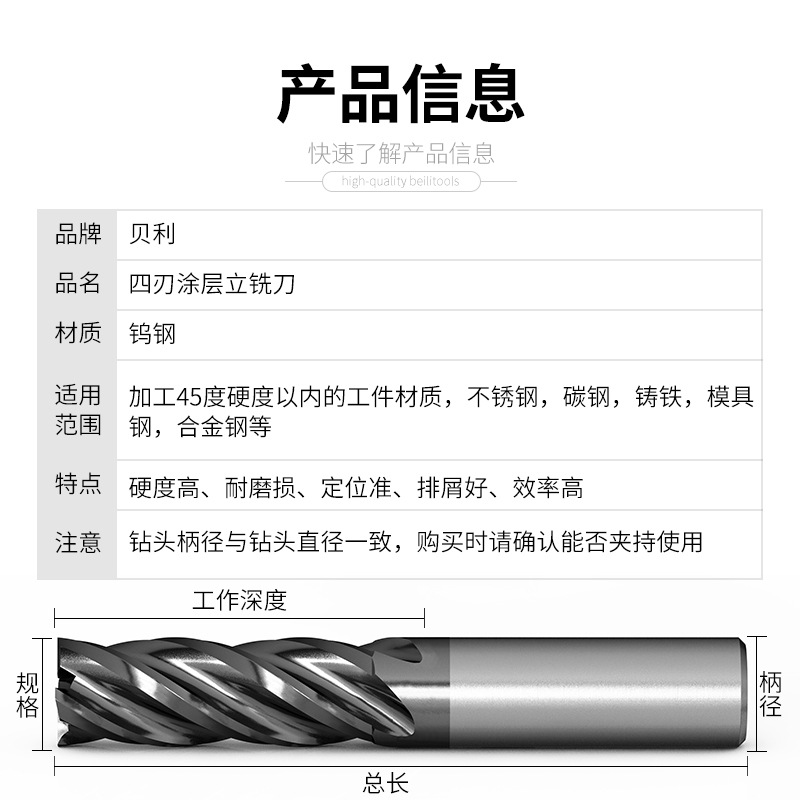 4刃钨钢铣刀数控硬质合金刀具加长不锈钢直柄立铣刀45度