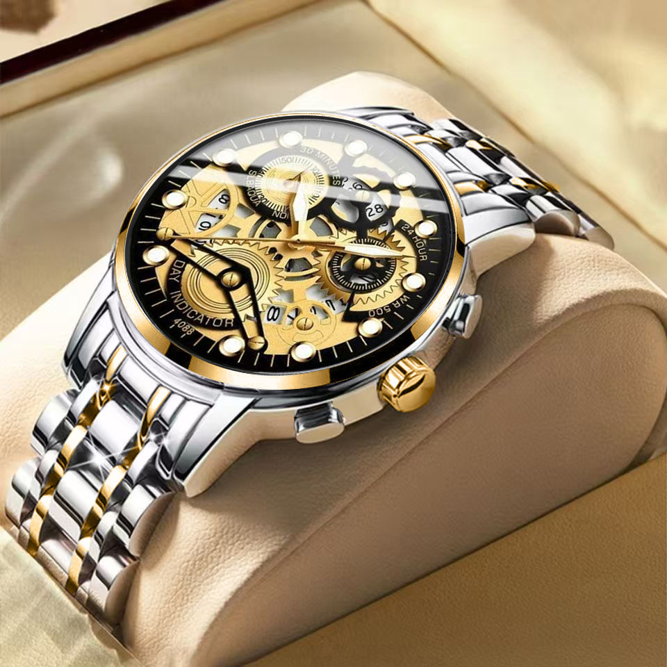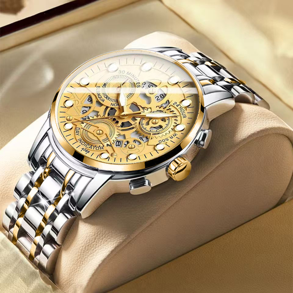 柏达茄新款防水多功能男士全自动机械表镂空夜光手表男精钢带日历