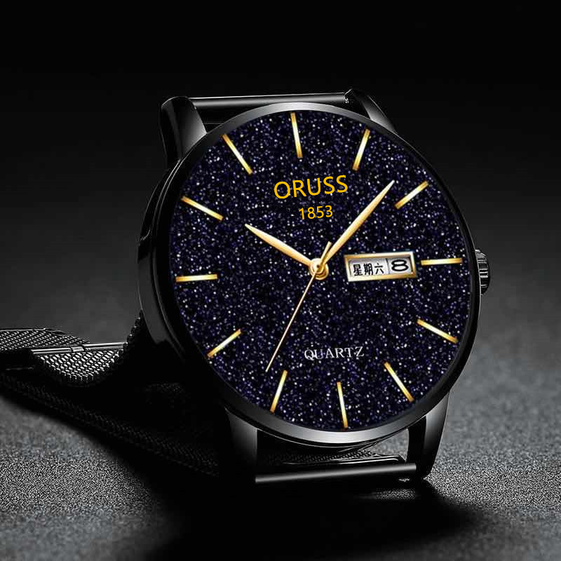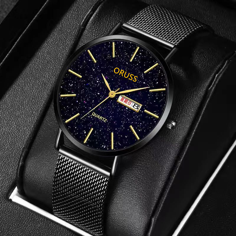 2025新款男士手表双日历超薄款防水夜光钢带石英腕表