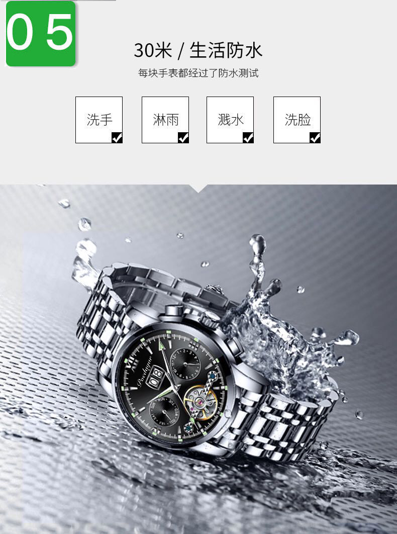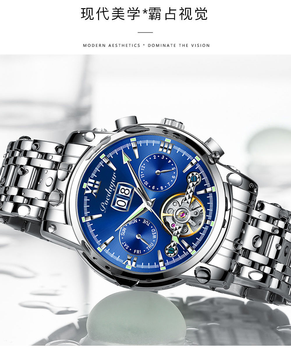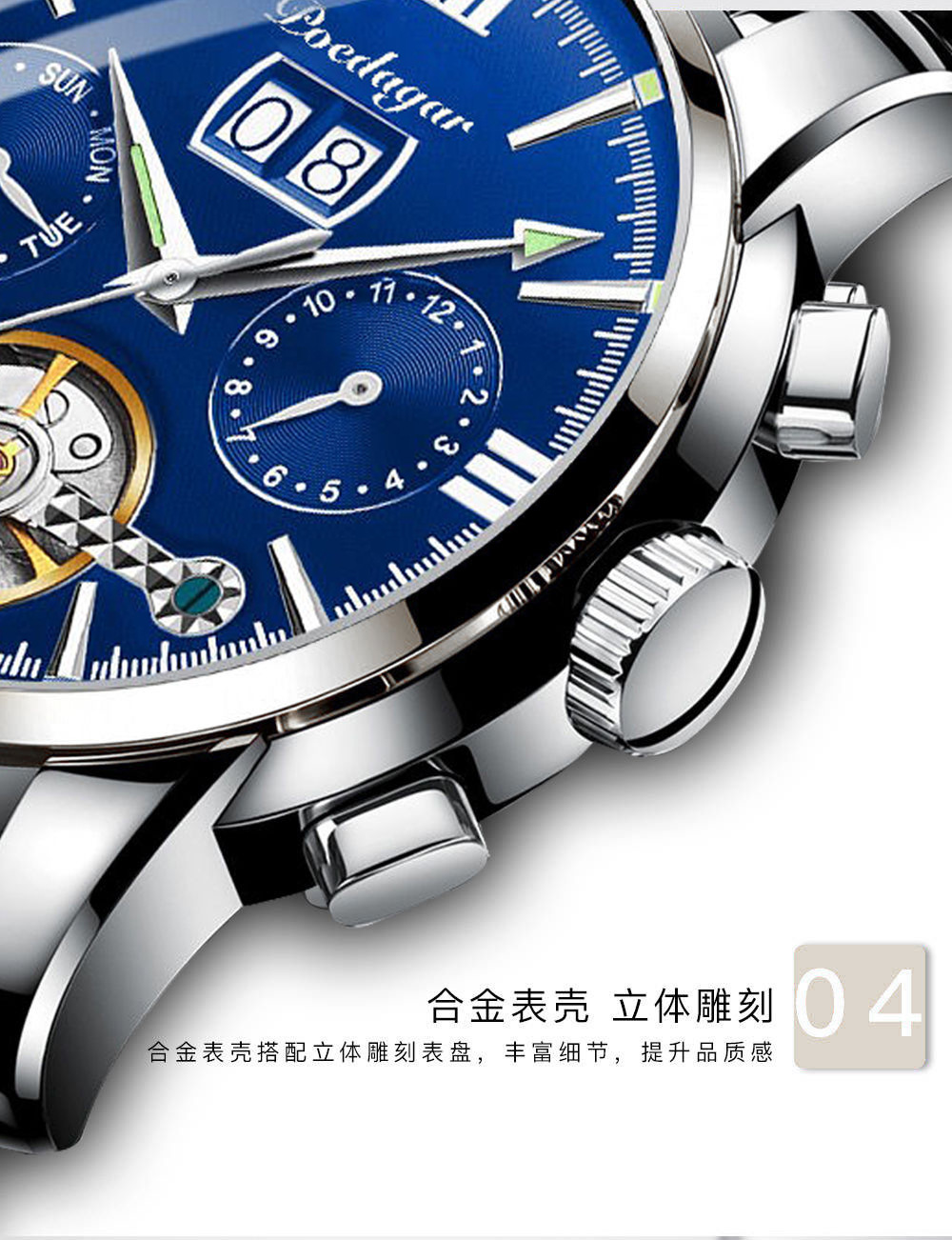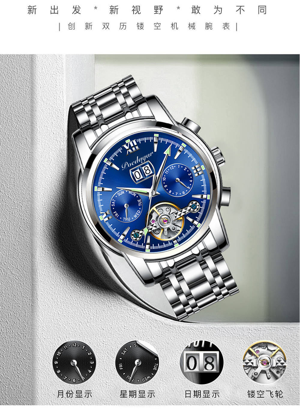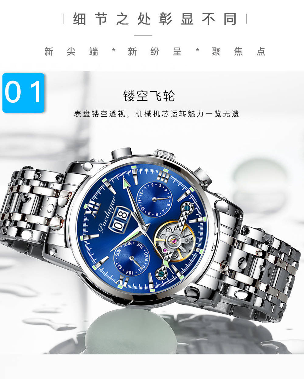 柏达茄新款防水多功能男士全自动机械表镂空夜光手表男精钢带日历