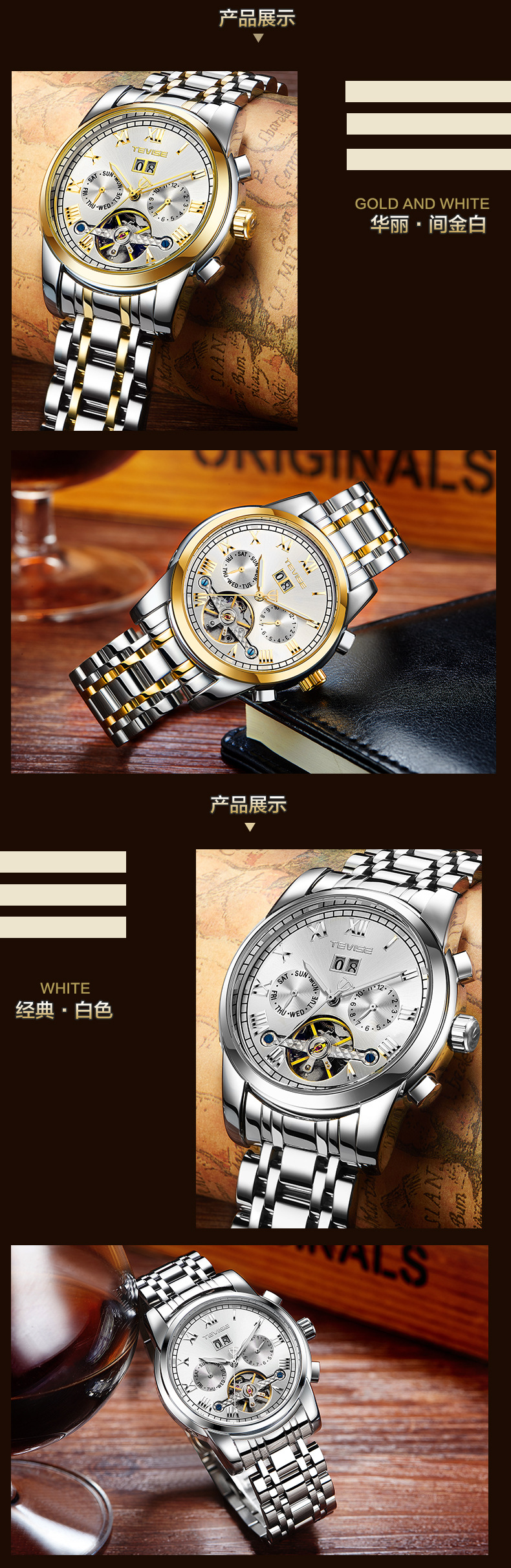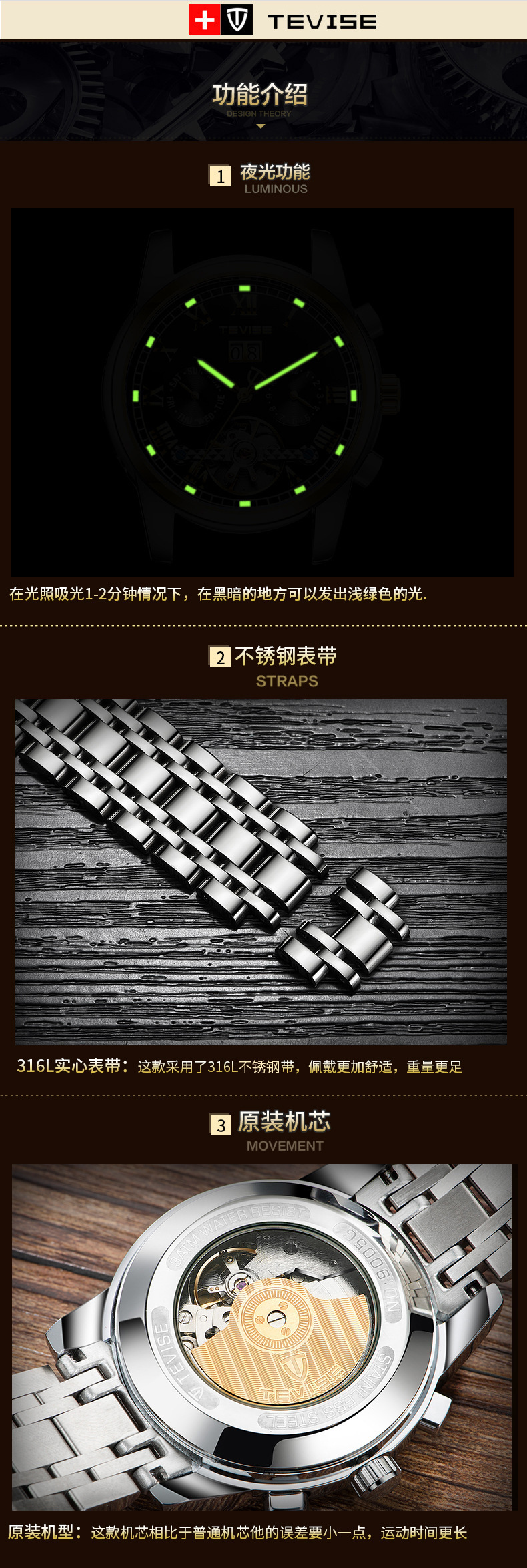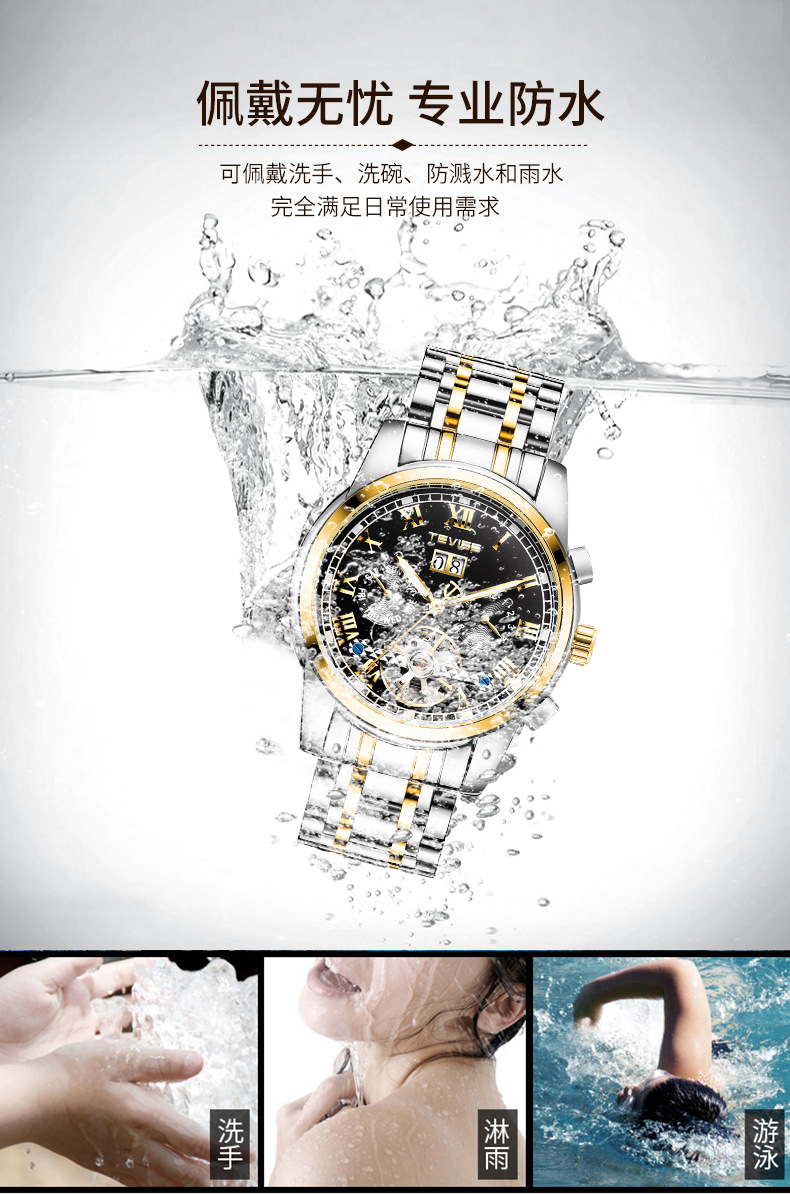 TEVISE特威斯网红手表月相星辰手表防水夜光陀飞轮夜光手表男