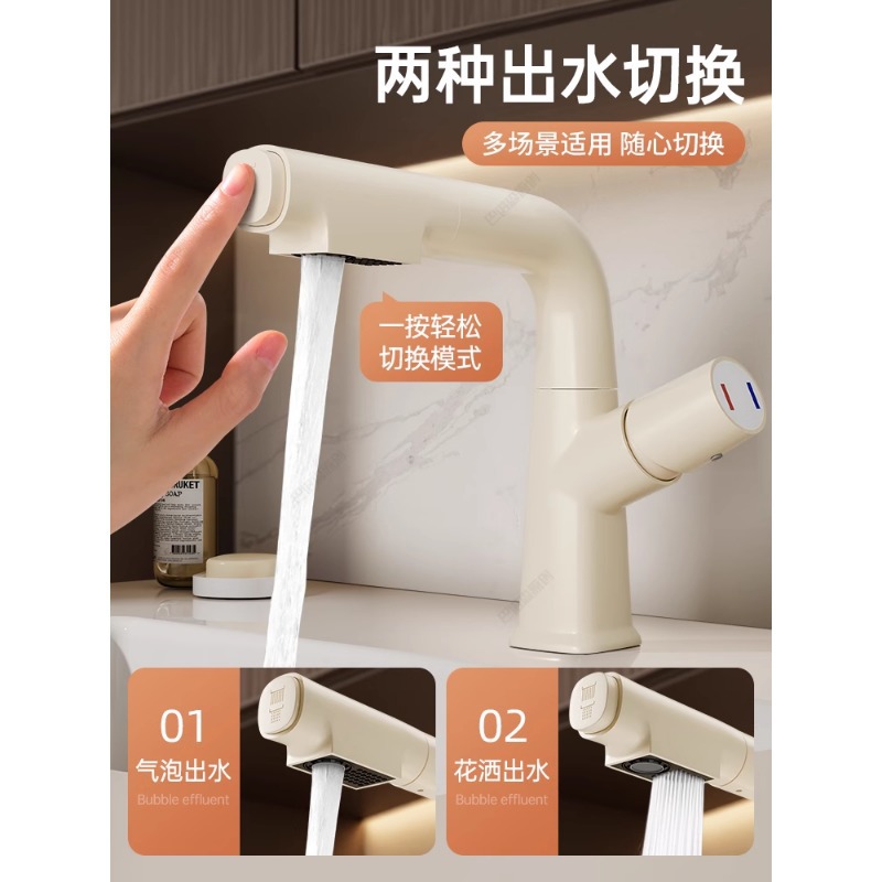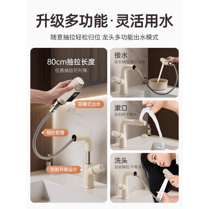 奶油风洗脸盆水龙头冷热二合一卫生间洗手面盆浴室家用升降抽拉式