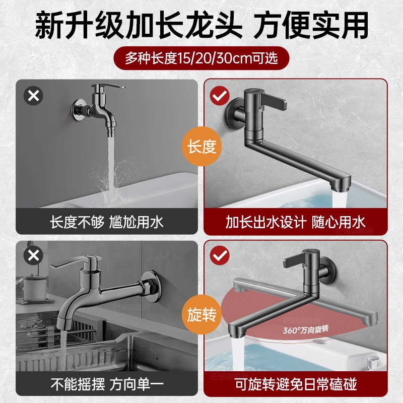 阳台拖把池加长水龙头入墙式单冷洗衣池水槽墙出水4分旋转可折叠