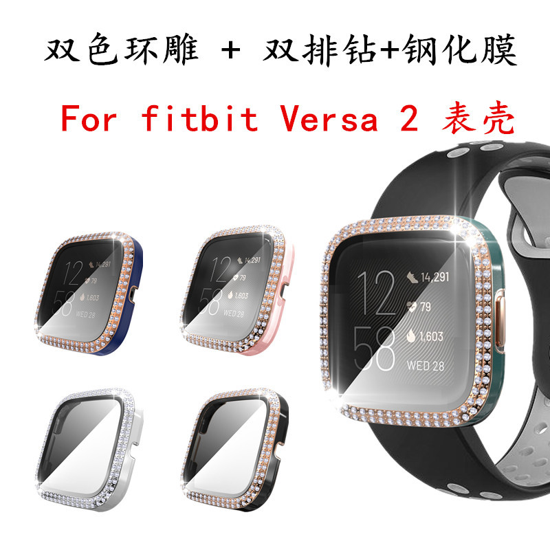 适用FitbitVersa2全包一体保护套PC双色双排钻+钢化膜抗摔表壳