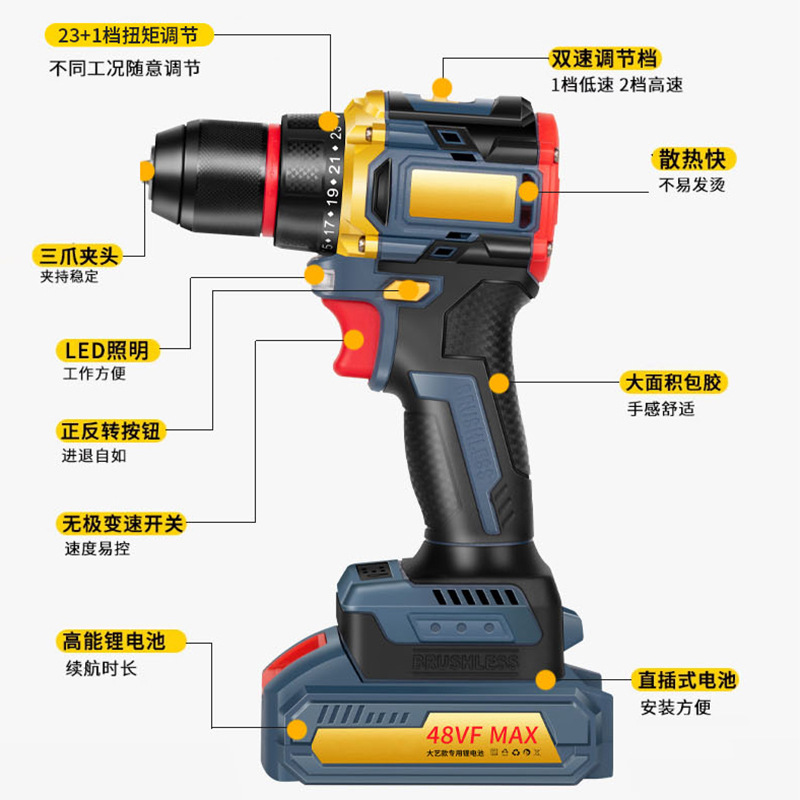 钻墙打孔多功能冲击锂电钻 家用纯铜无刷手电钻小钢炮