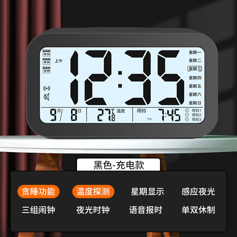 - 黑色-温湿度款【七大功能+大音量+单双休】