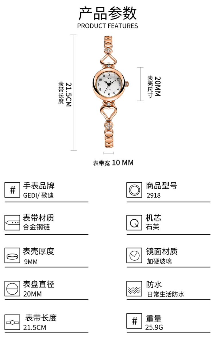 歌迪新款精致合金女表小巧高级感石英表女士防水轻奢手链手表