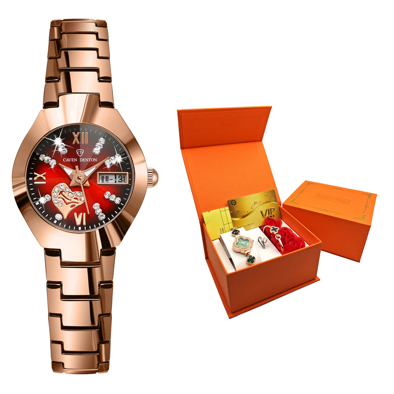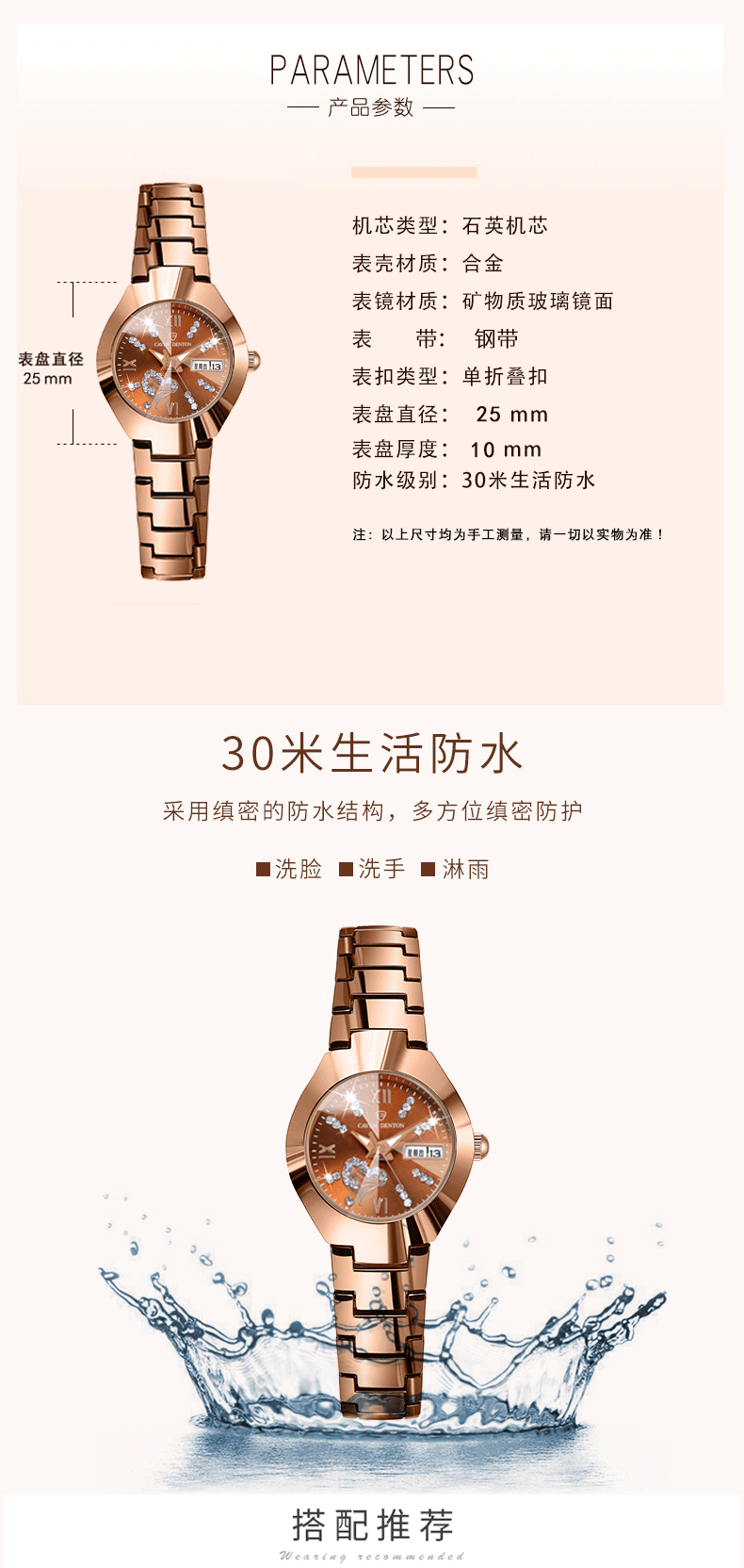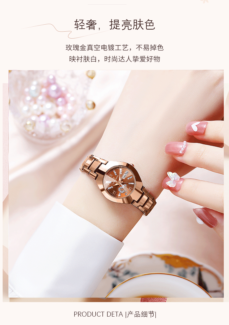 韩版时尚潮流女士腕表双日历镶钻防水夜光手表