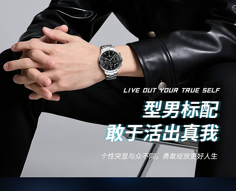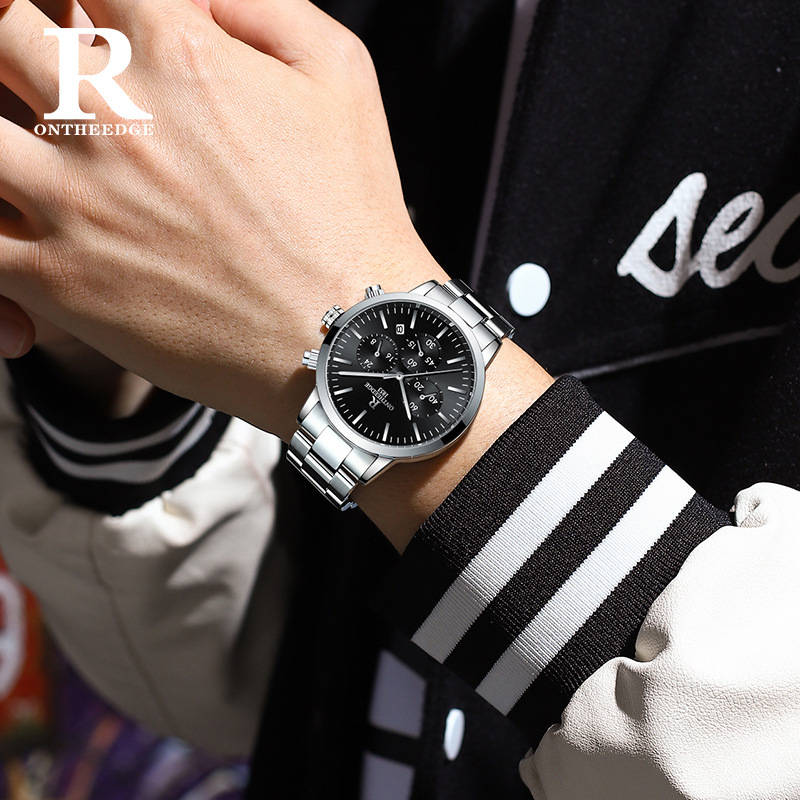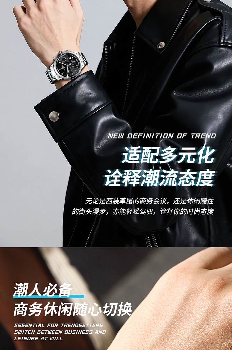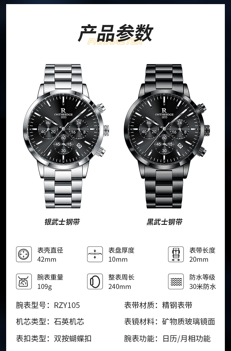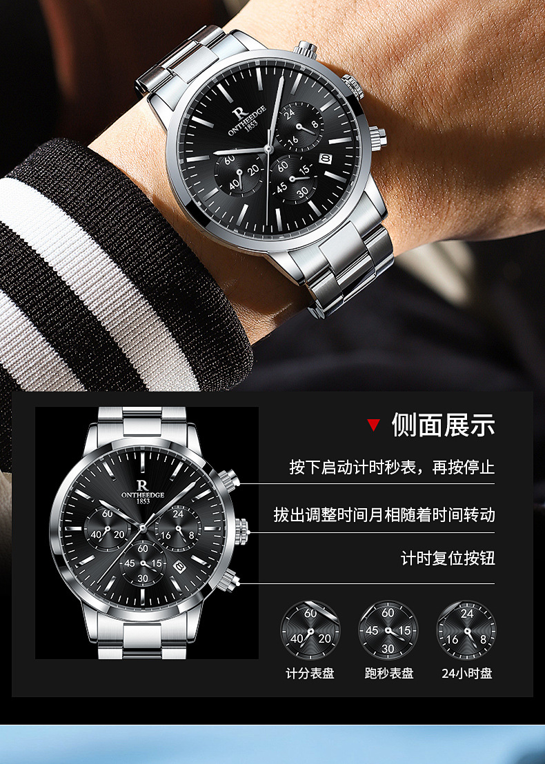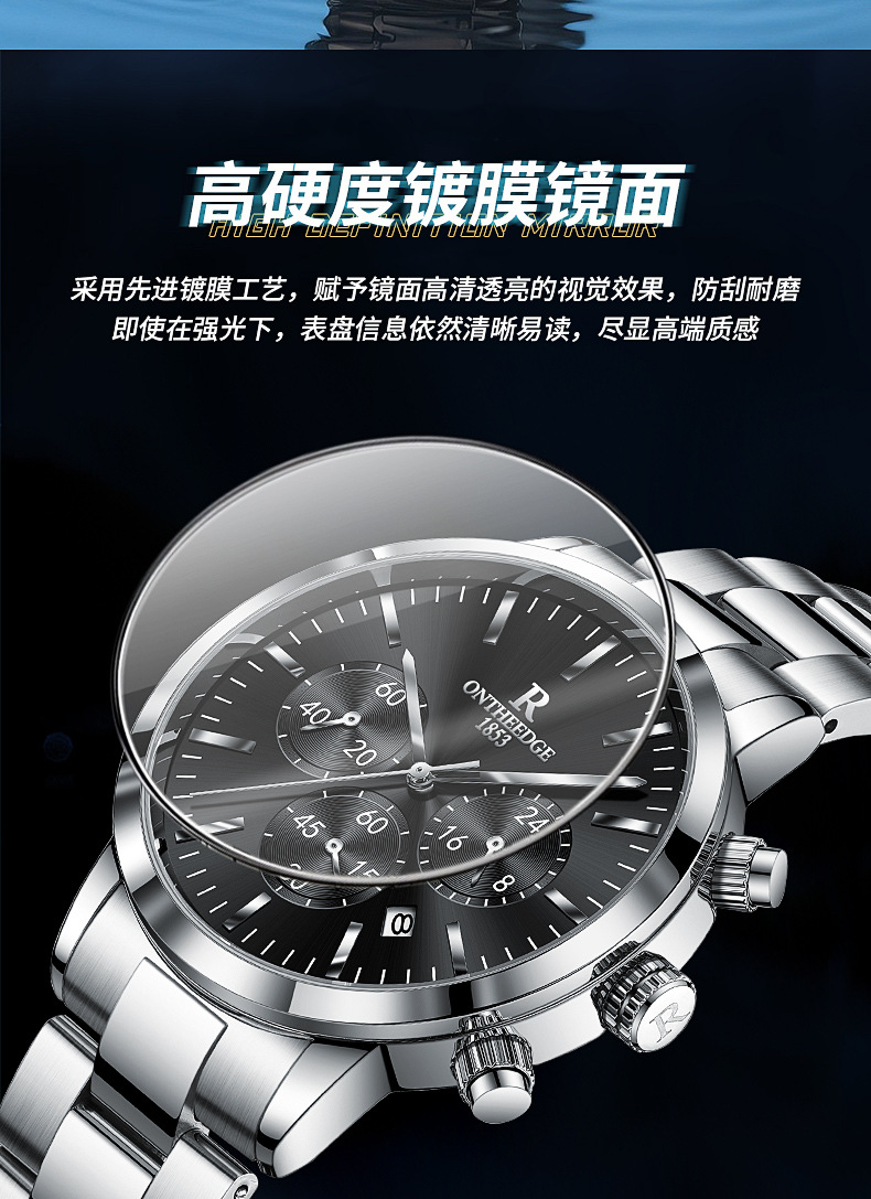 瑞之缘新款多功能防水玻璃石英表实心钢带时尚商务高级感男士手表