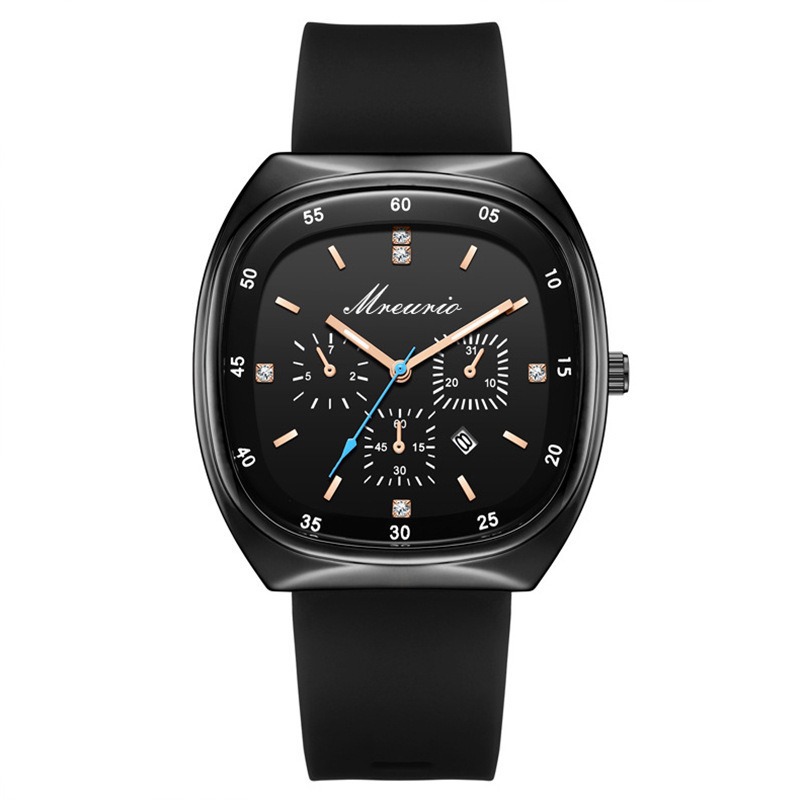 三眼蓝针男士手表百搭潮流时尚高档精致石英表硅胶带大表盘手表