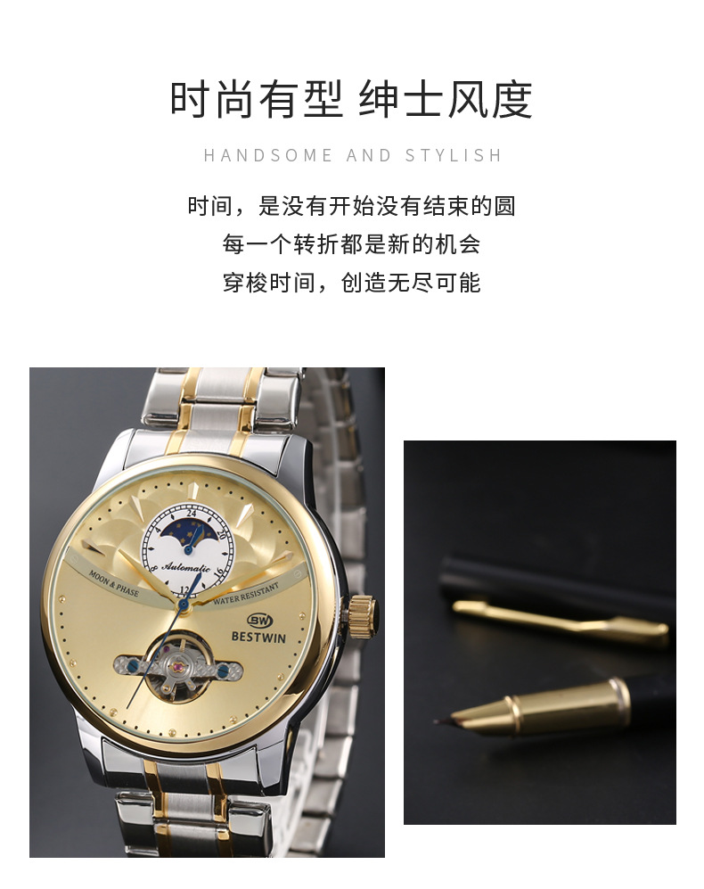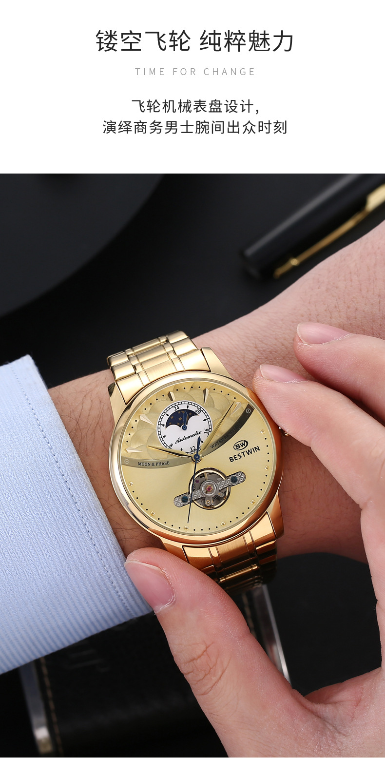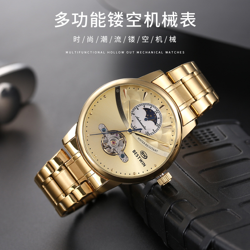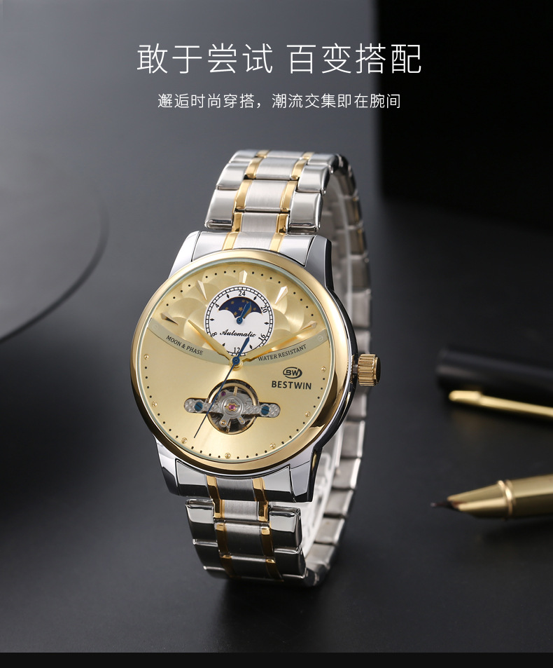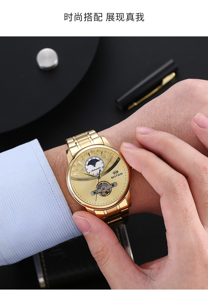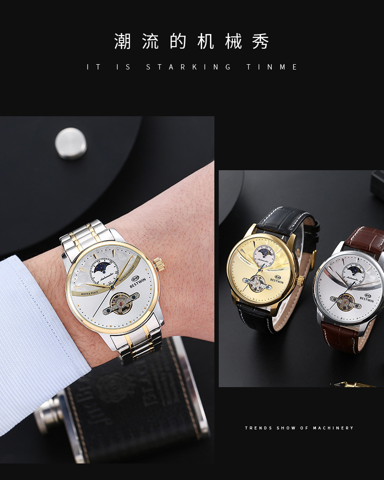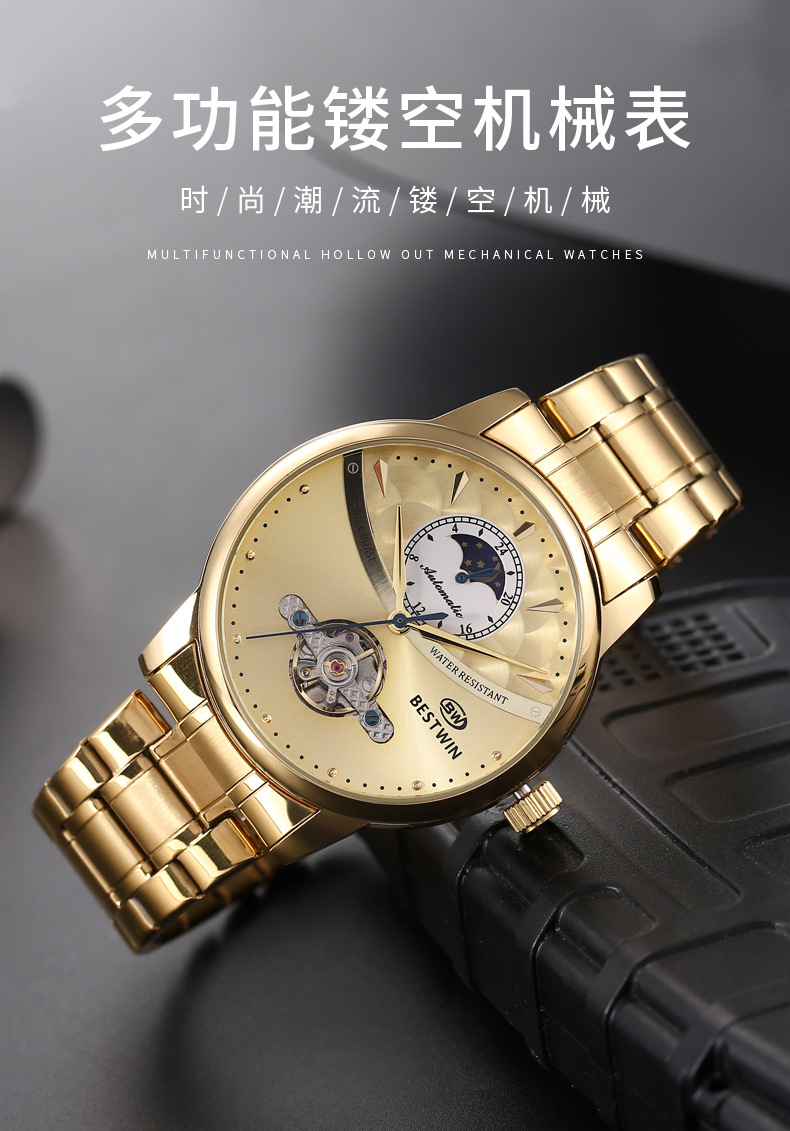 机械表镂空合金男士手表男表博士通BESTWIN蝴蝶双按扣