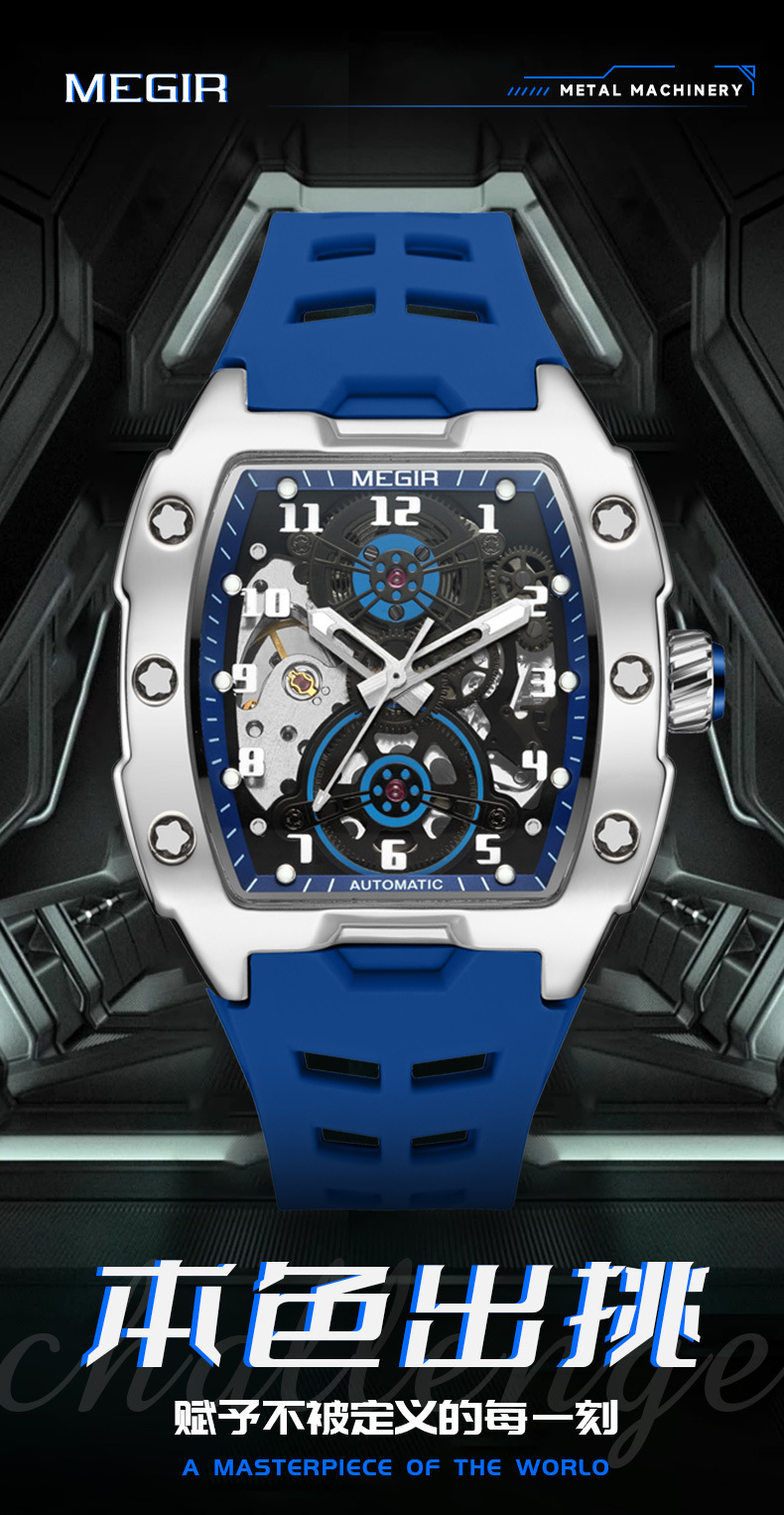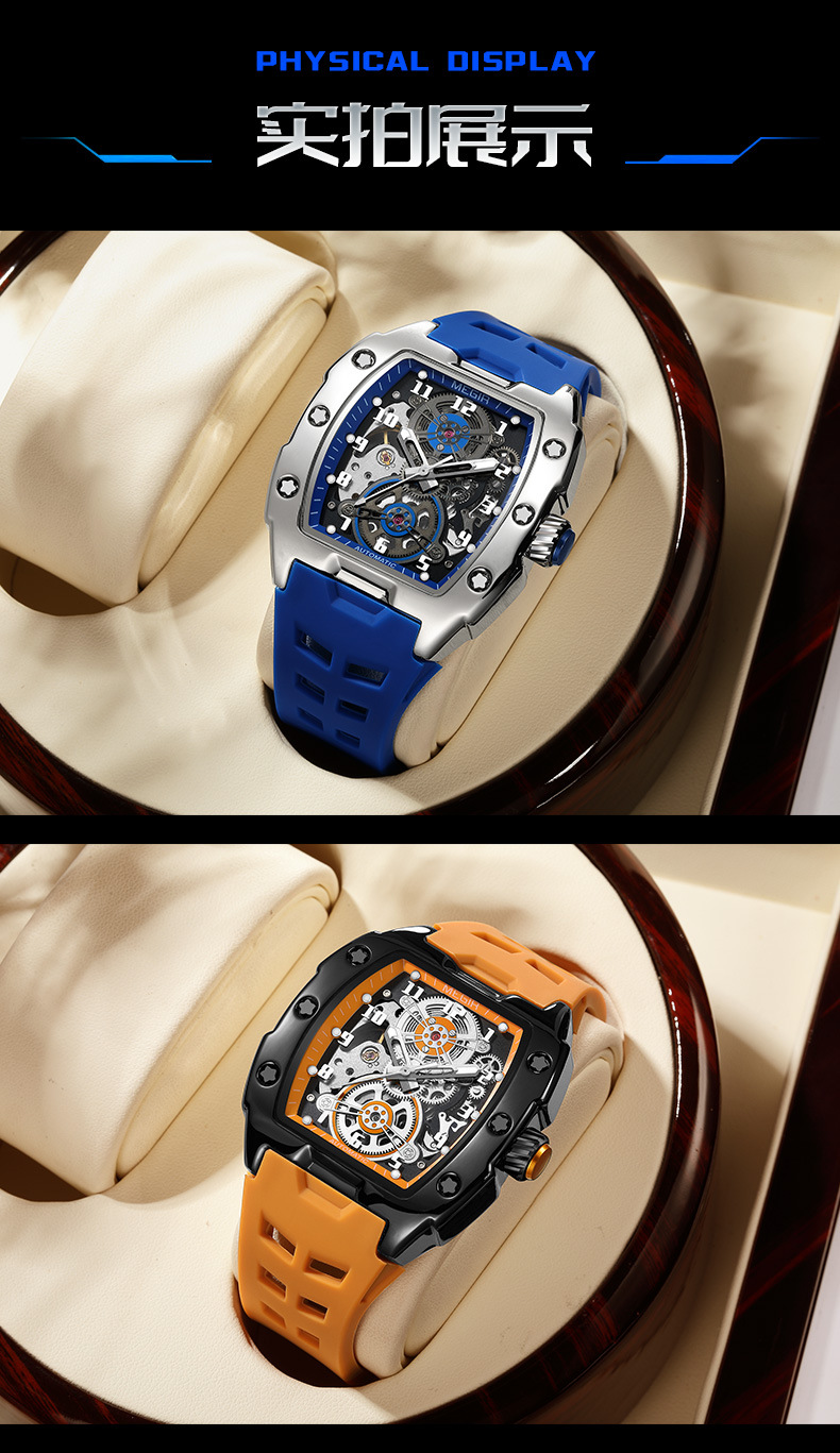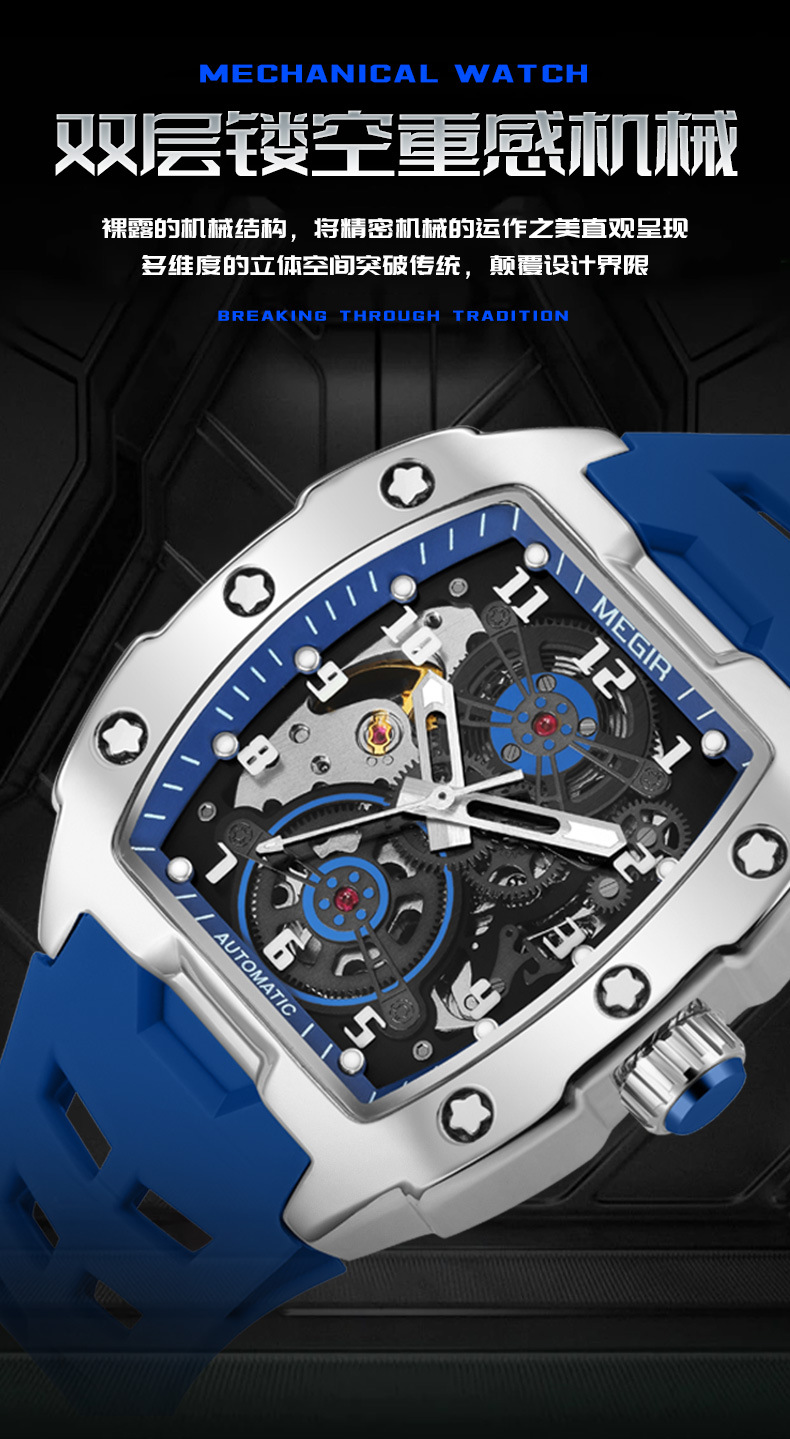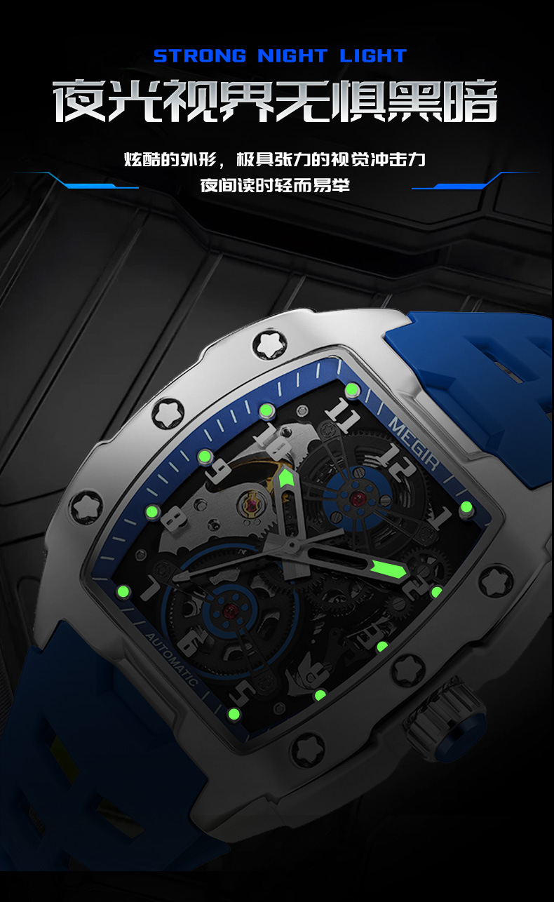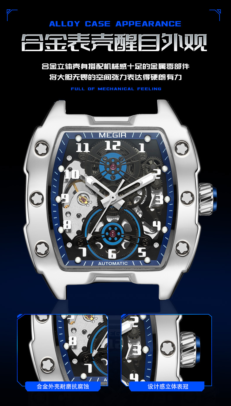 MEGIR新款男士酒桶型镂空机械手表男士休闲全自动夜光机械表