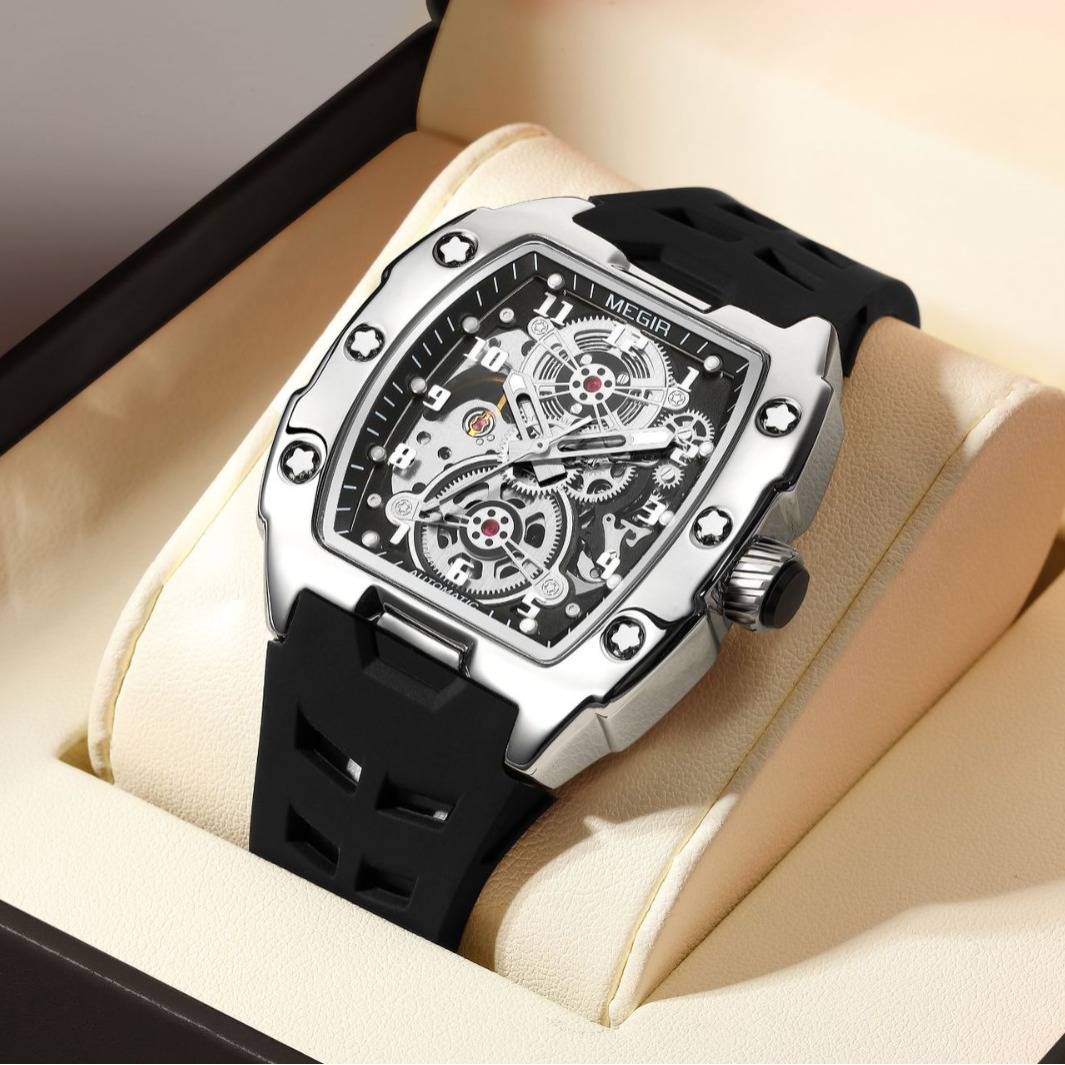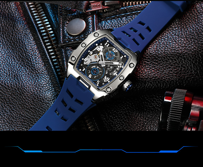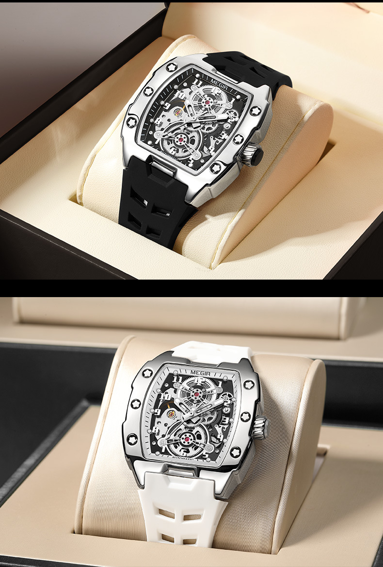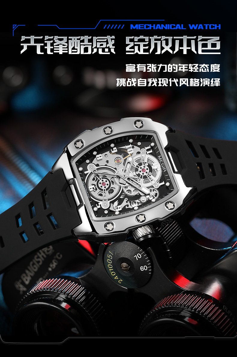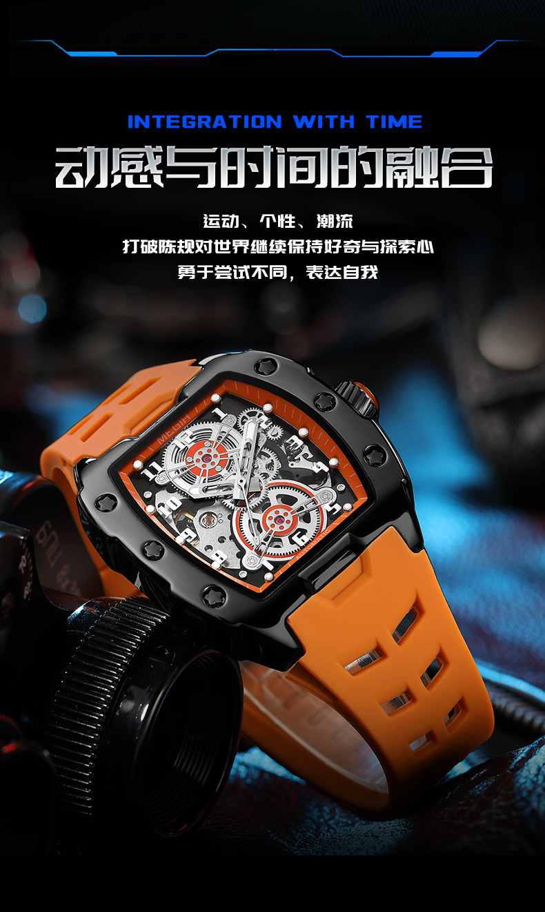 MEGIR新款男士酒桶型镂空机械手表男士休闲全自动夜光机械表