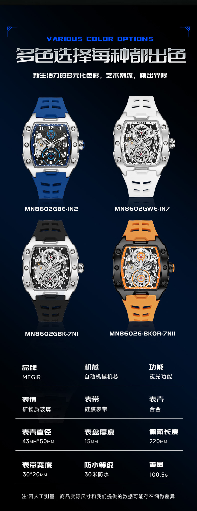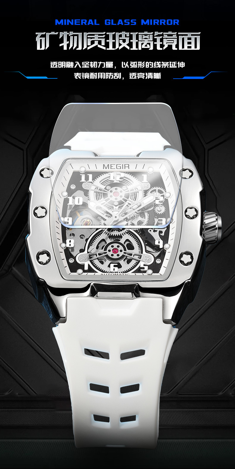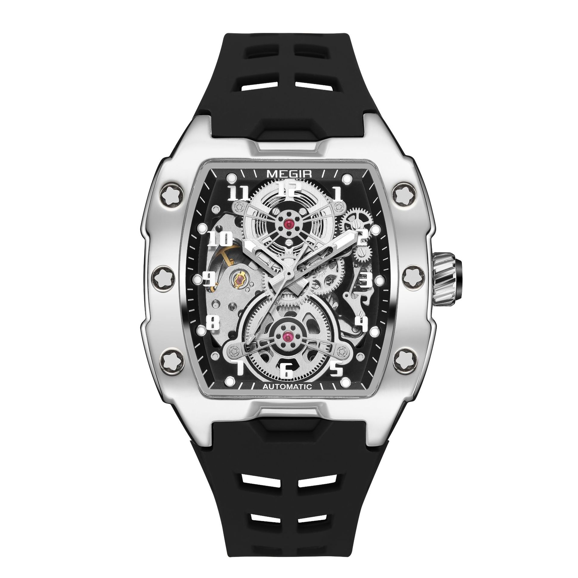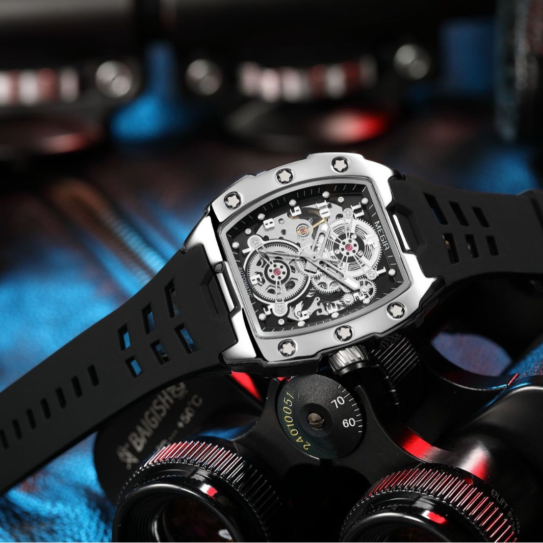 MEGIR新款男士酒桶型镂空机械手表男士休闲全自动夜光机械表