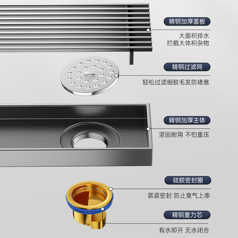长条形地漏304不锈钢加宽大排量浴室卫生间淋浴房下水道防臭枪灰