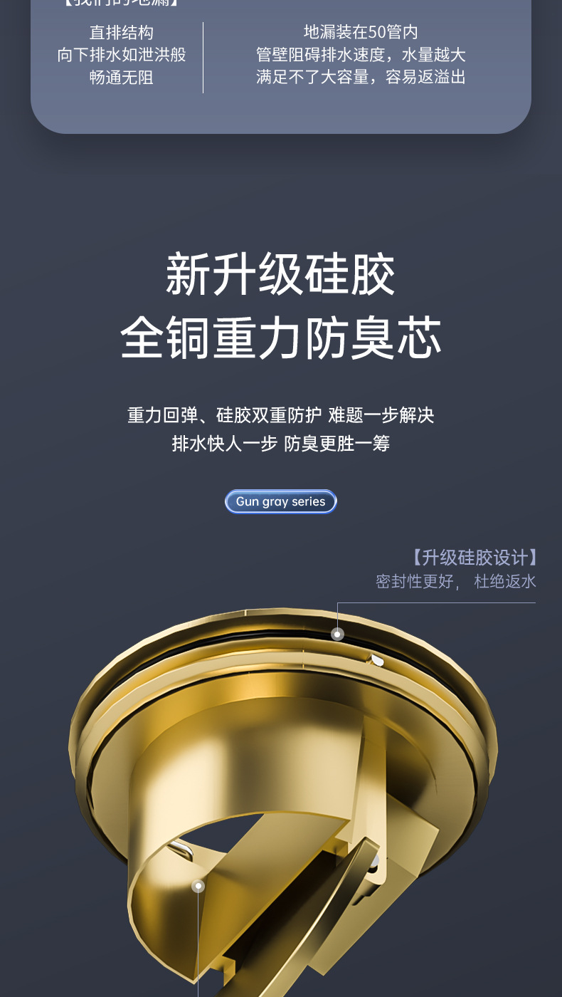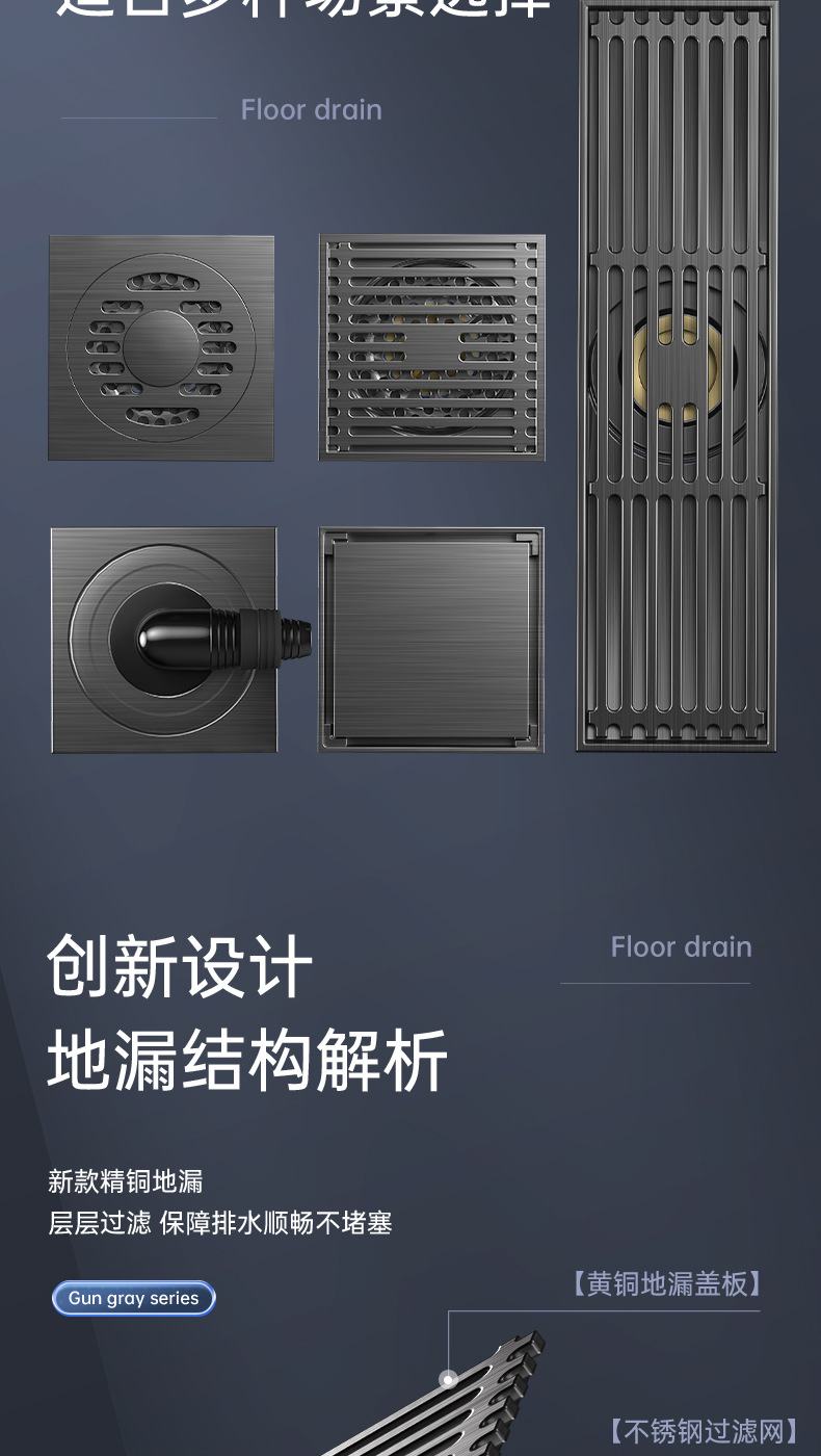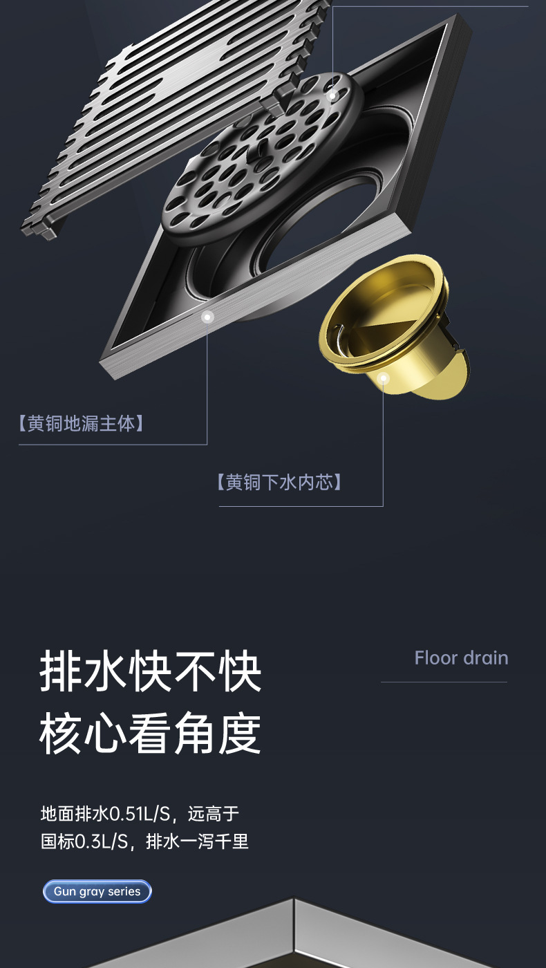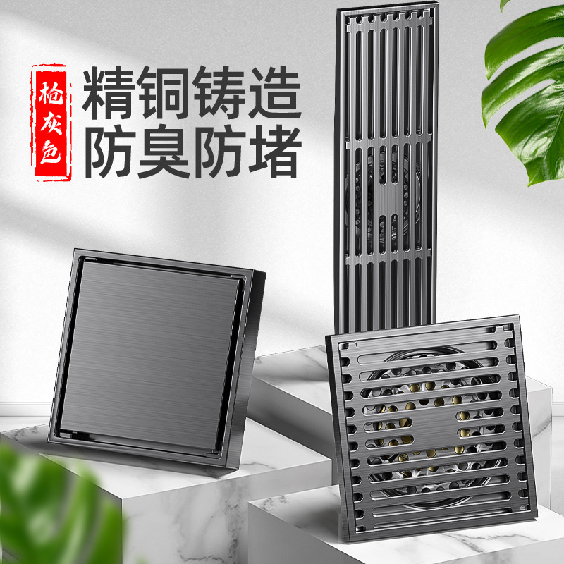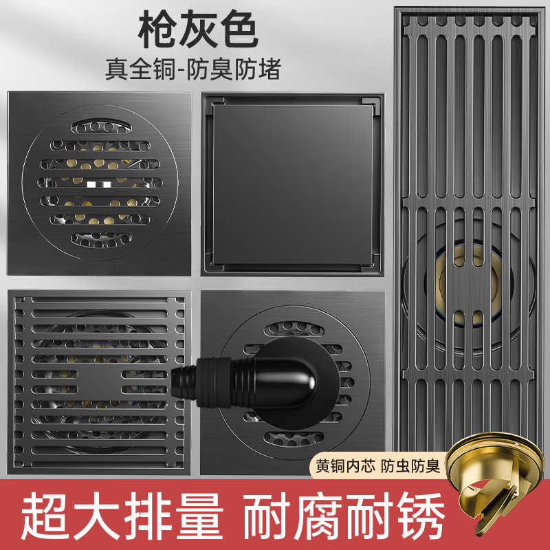 全铜地漏加厚枪灰色防臭地漏浴室卫生间通用大排量