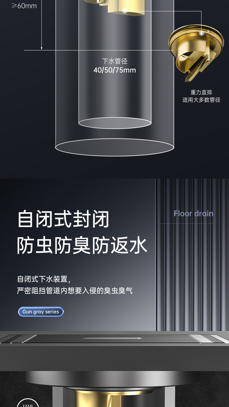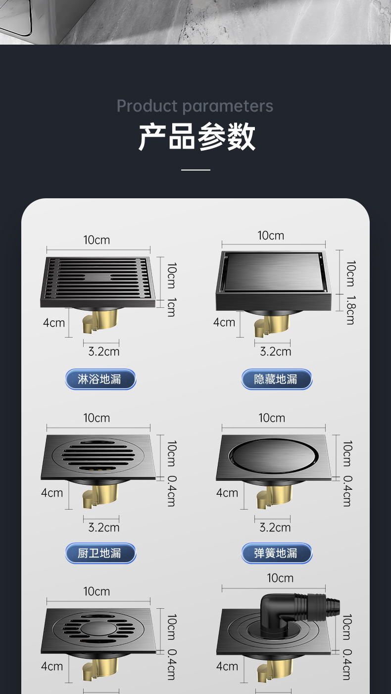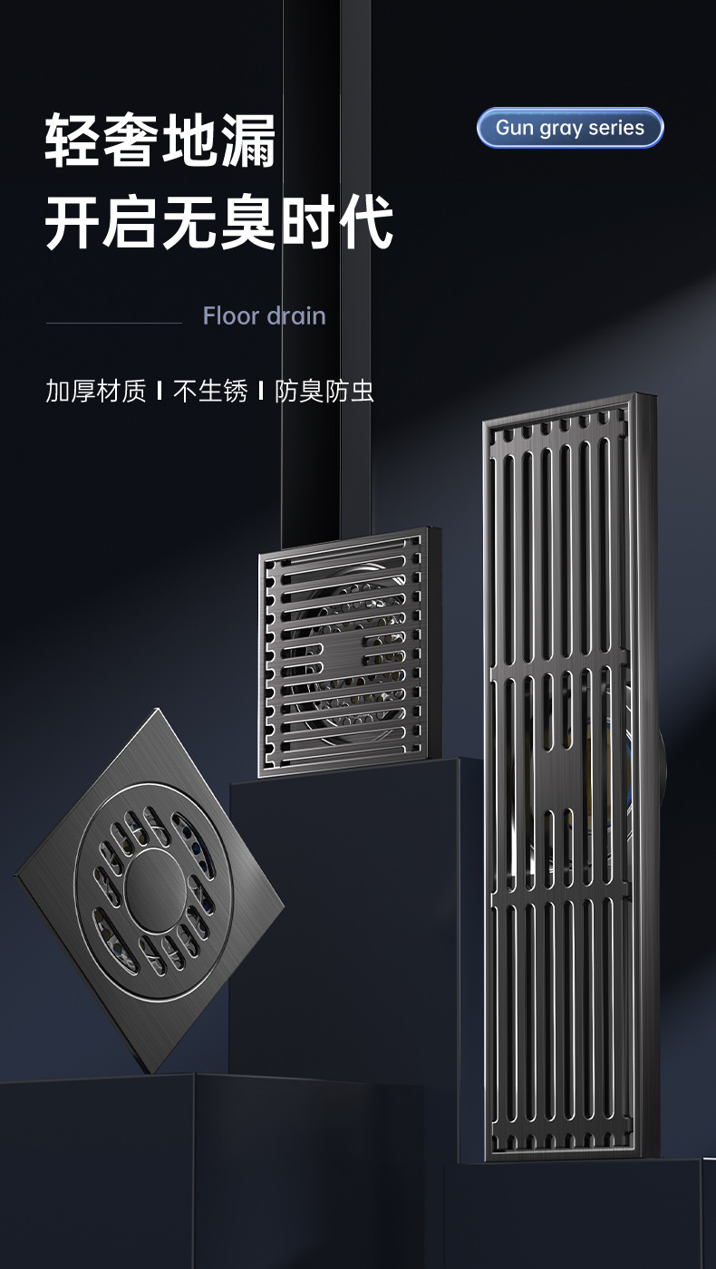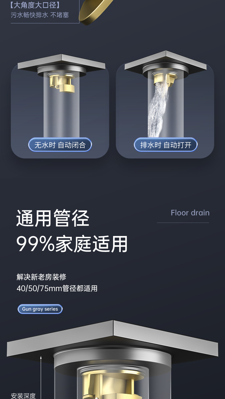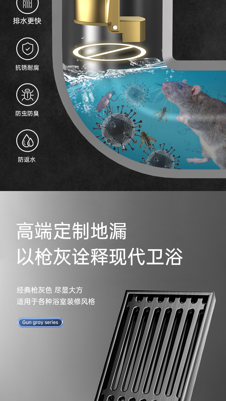 全铜地漏加厚枪灰色防臭地漏浴室卫生间通用大排量