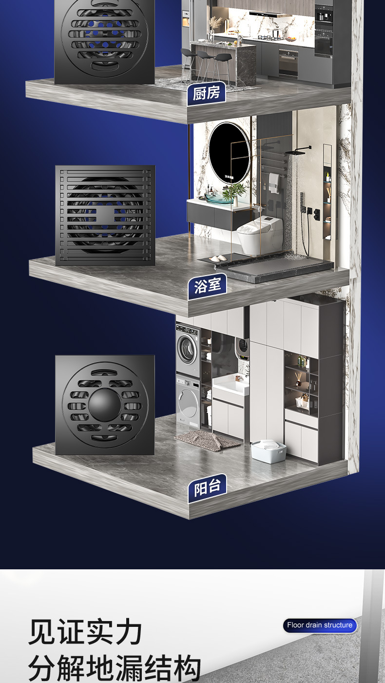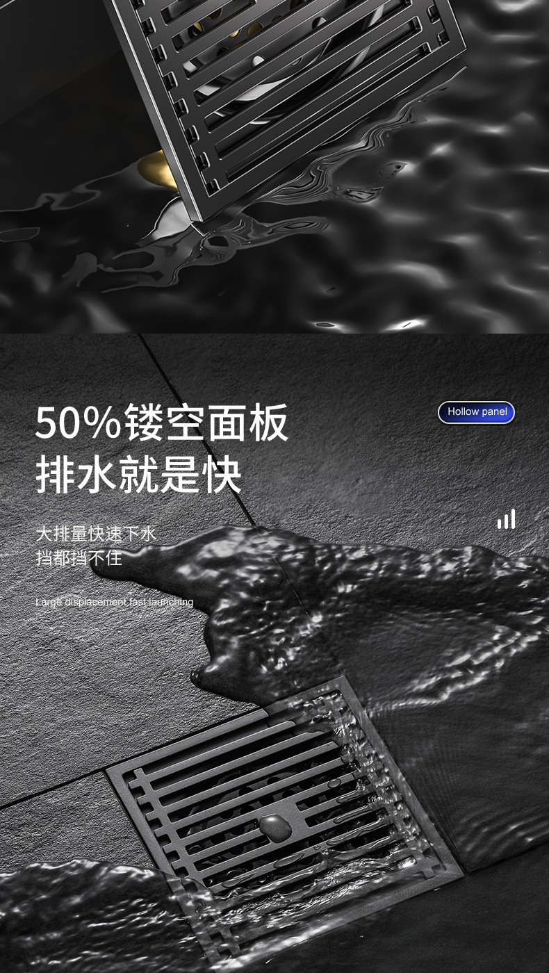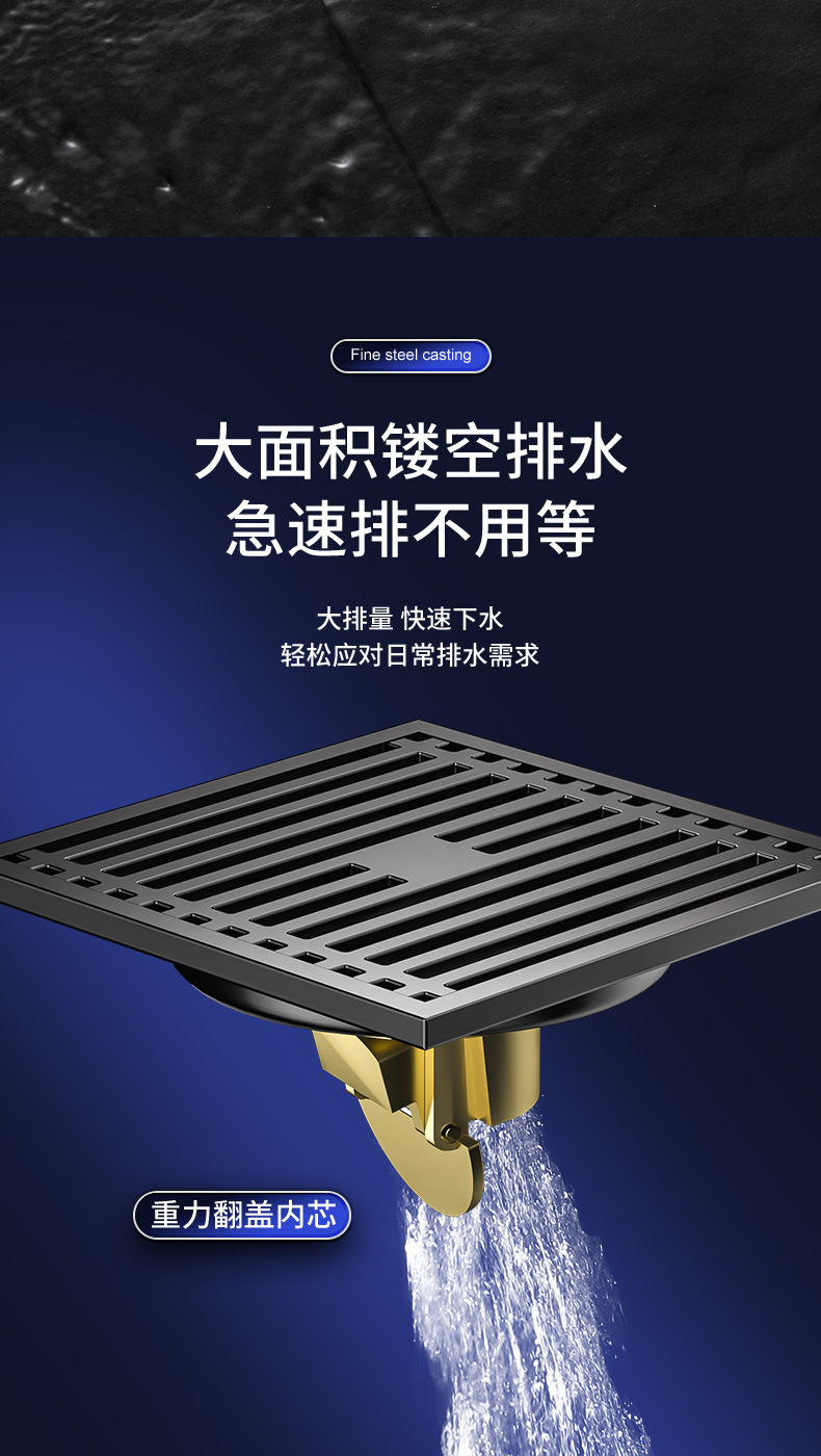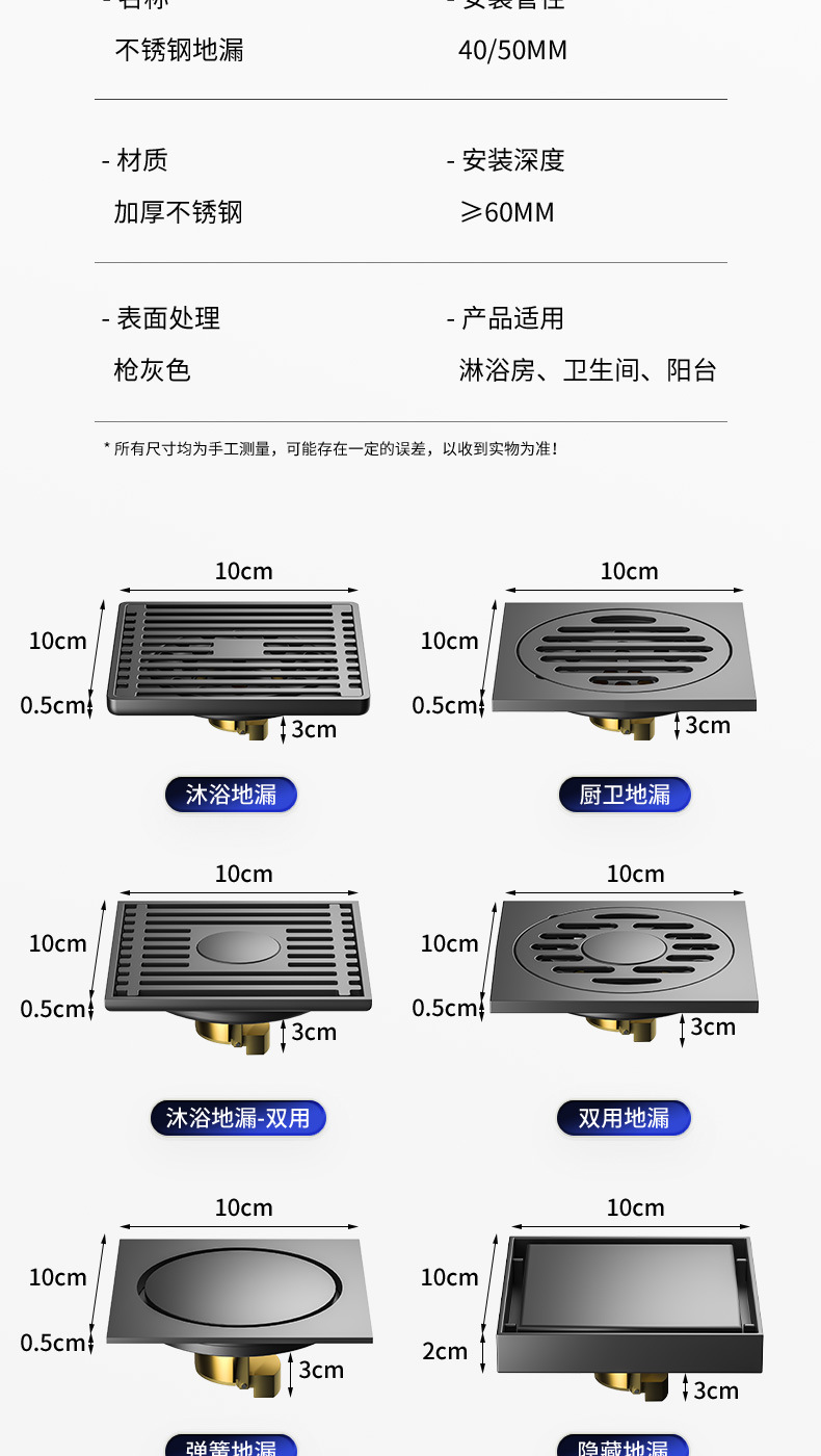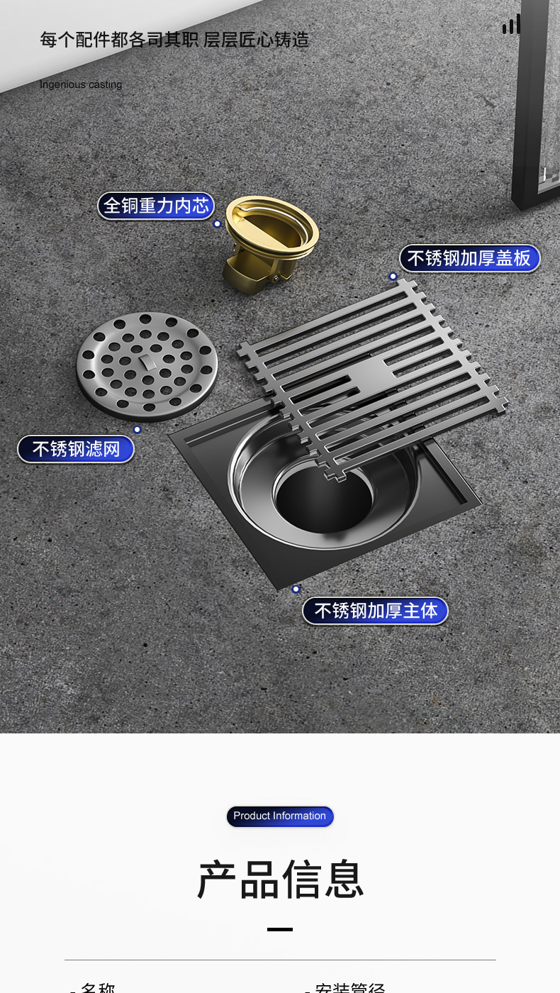 304不锈钢防臭隐形地漏枪灰色全铜地漏芯卫生间淋浴房洗衣机两用