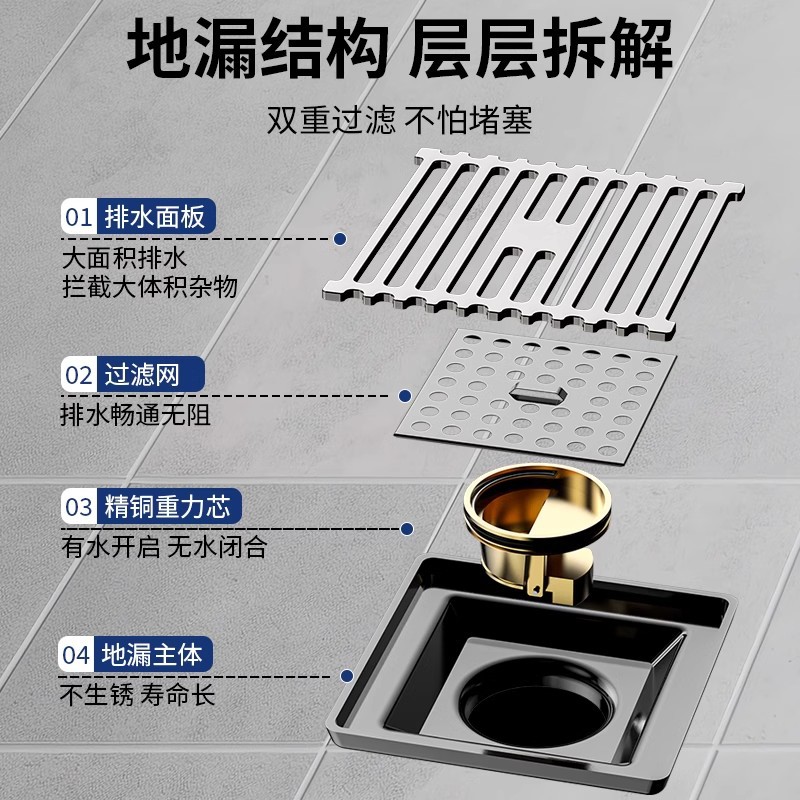 不锈钢防臭地漏方形卫生间浴室淋浴房洗衣机下水道防虫臭枪灰地漏