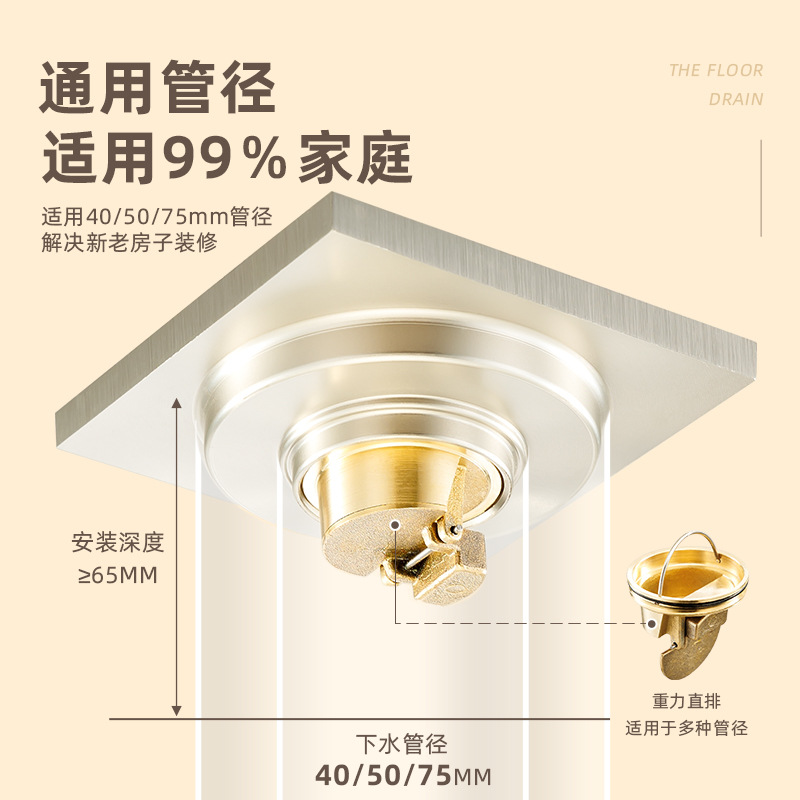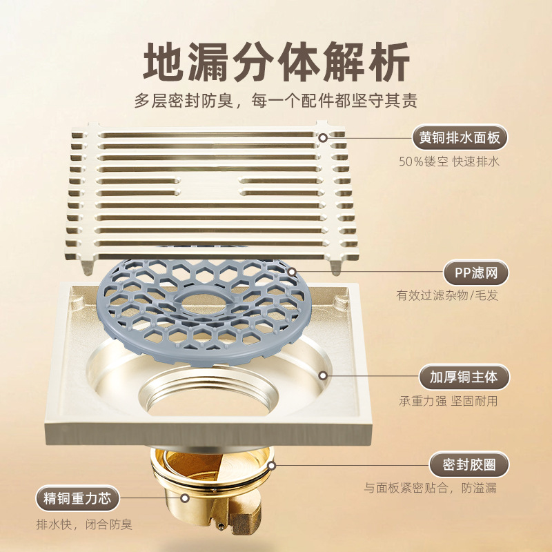 奶油风铜拉丝防虫臭地漏家用厨房淋浴室阳台下水道洗衣机大排量