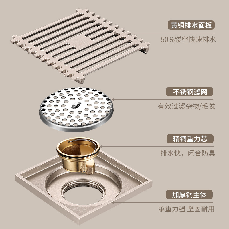 铜四方精雕拉丝地漏(单用)