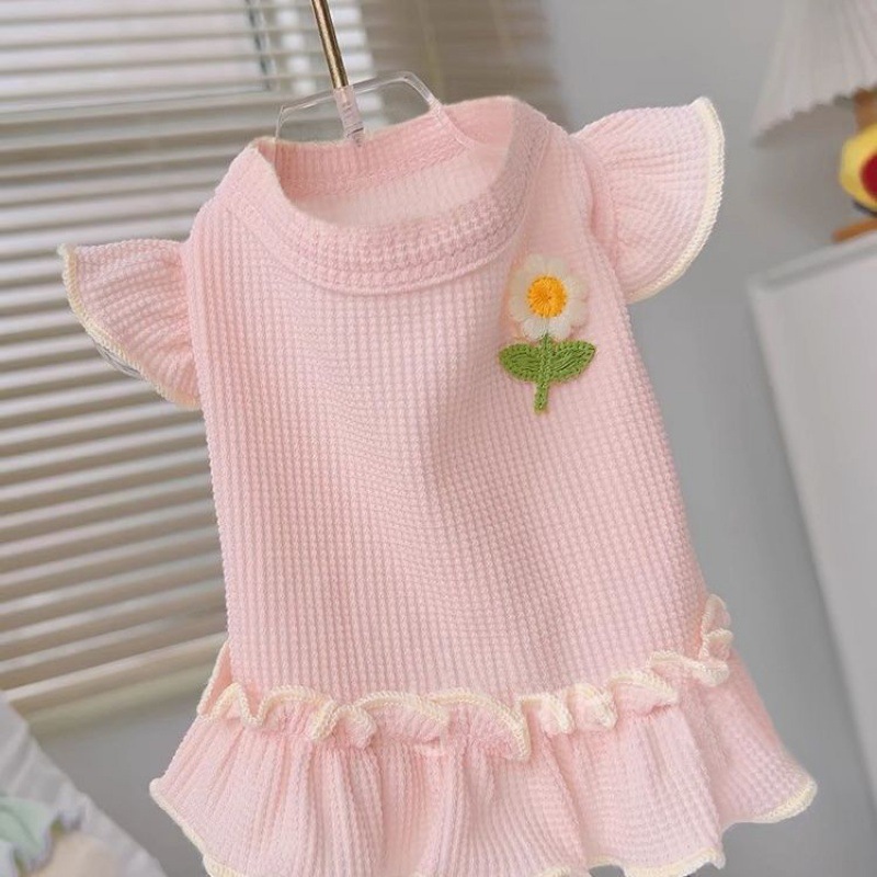 宠物猫咪泰迪可爱透气服比熊狗狗衣服春夏新款华夫格小花飞袖裙子