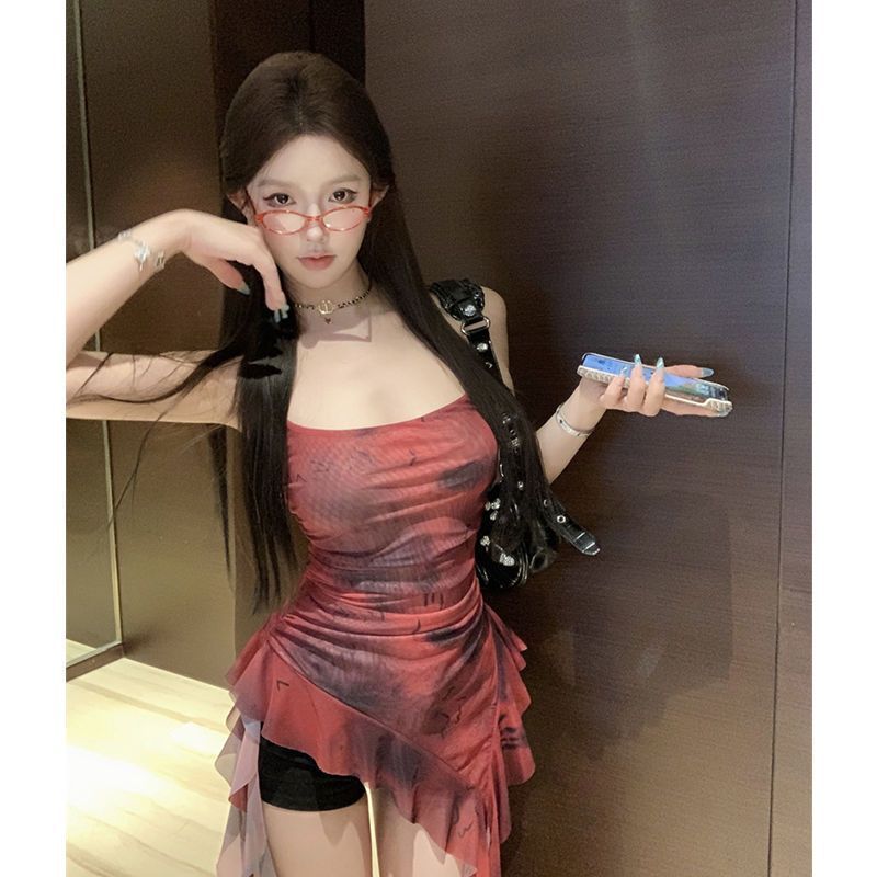 美式复古不规则荷叶边吊带背心女夏扎染晕染辣妹收腰显瘦上衣外穿