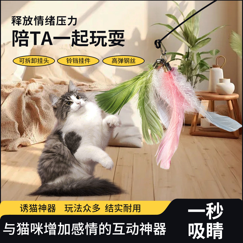 长杆逗猫棒羽毛钢丝铃铛逗猫玩具替换头咬不烂宠物用品猫玩具