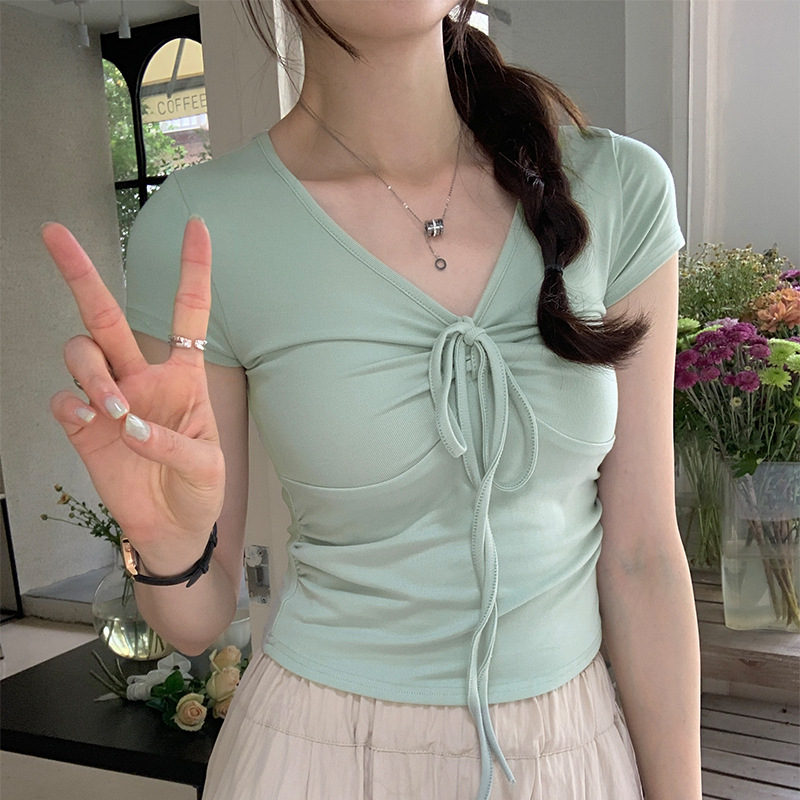 韩系气质甜妹纯色V领正肩T恤女夏季侧腰抽褶掐腰显瘦短袖上衣