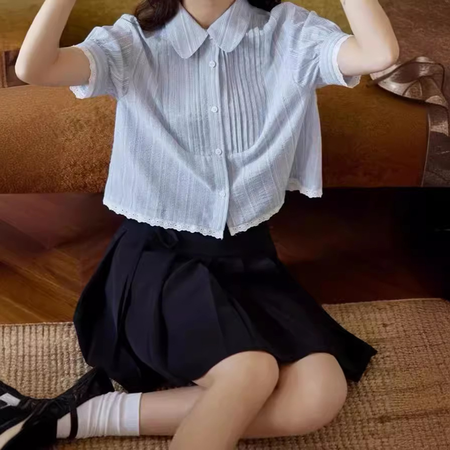 「凉感莫代尔Modal^柔软亲肤」圆领衬衫女小众短袖上衣