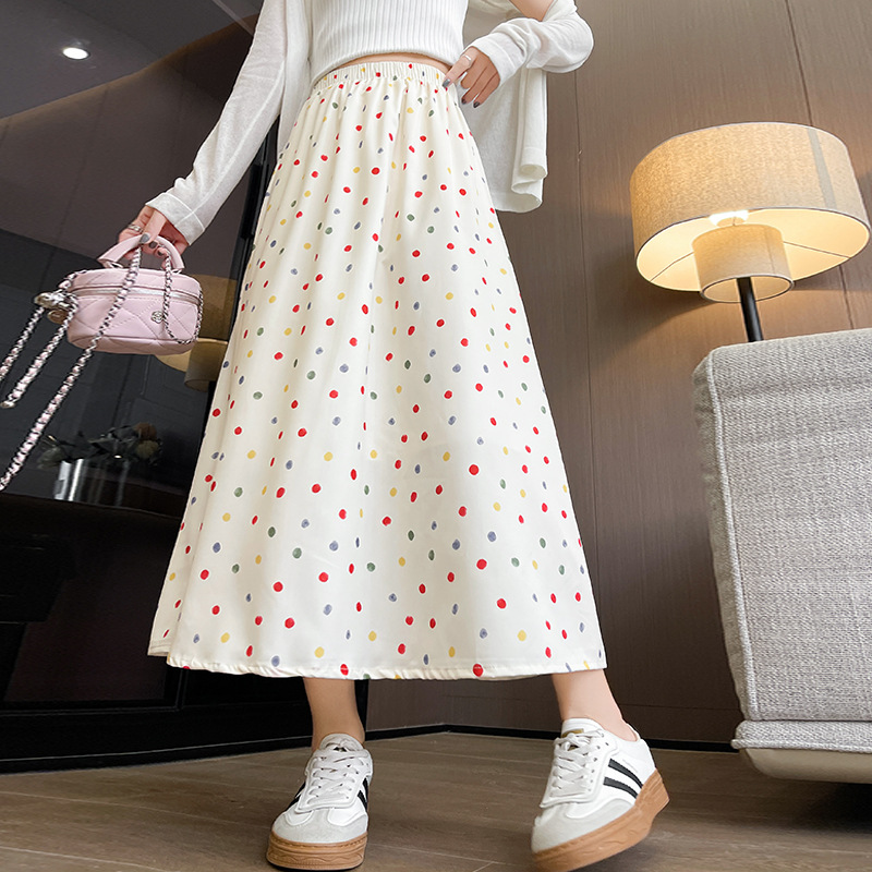 日系彩色圆点半身裙女夏季甜美小清新松紧高腰中长裙宽松大摆长裙