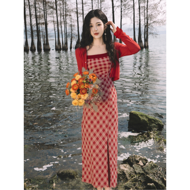 法式复古红色格子吊带连衣裙2025新款夏日绝美海边度假沙滩长裙子