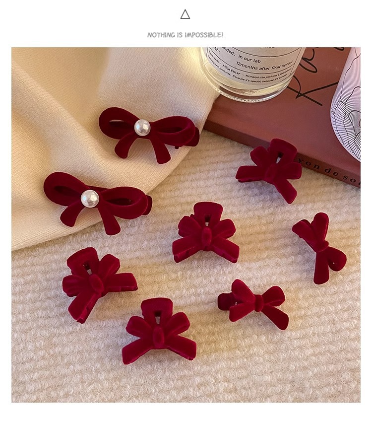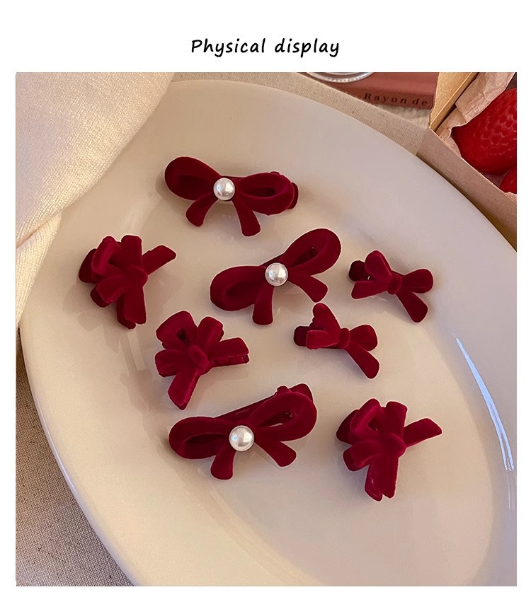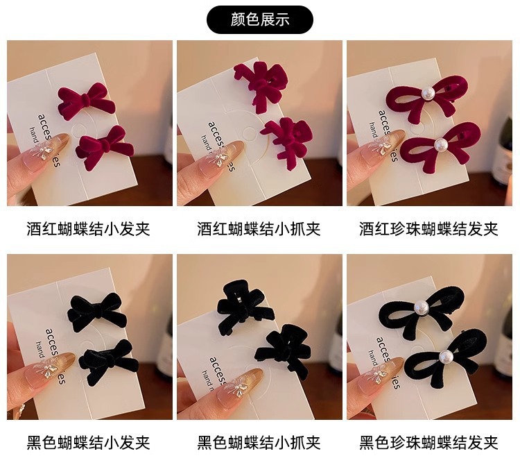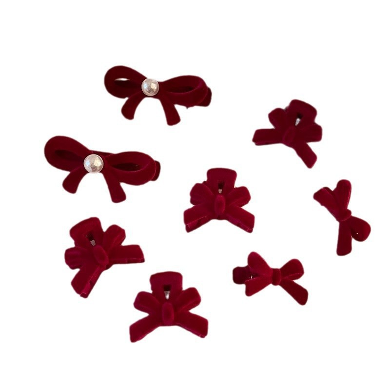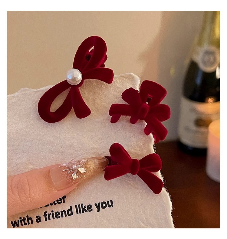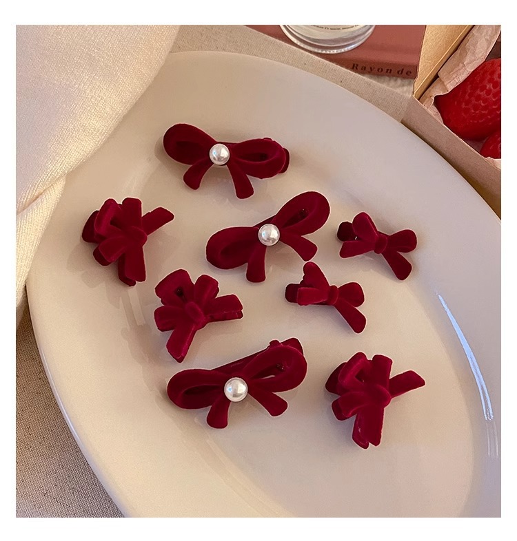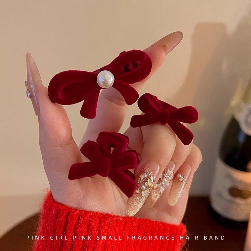 新年红色丝绒珍珠蝴蝶结刘海发夹女高级感侧马尾编发夹子圣诞头饰