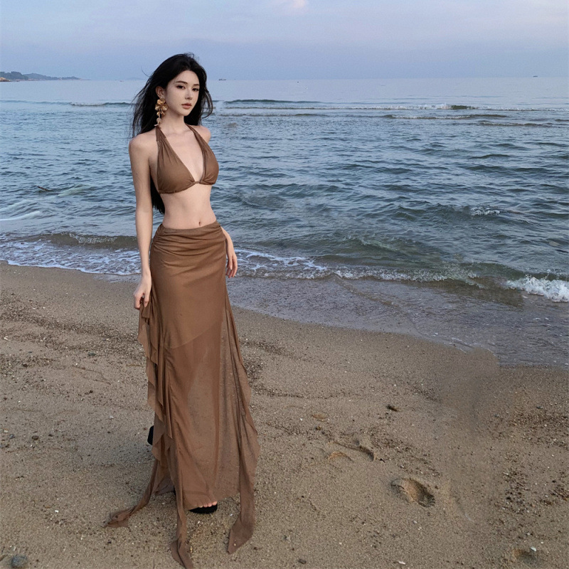 夏新款海边度假高级感挂脖抹胸+遮肚显瘦荷叶边半身裙两件套套装