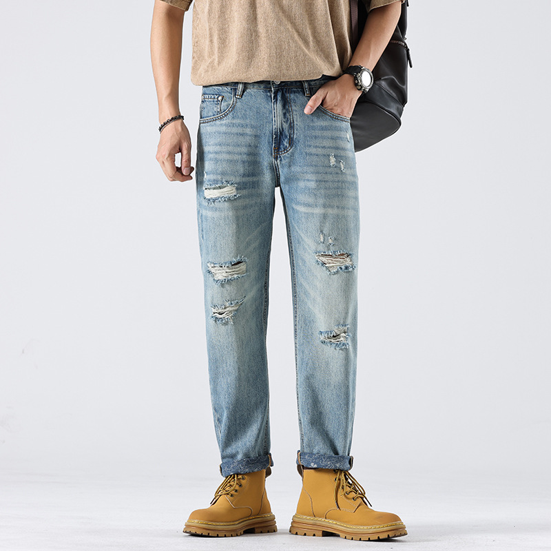 春季新款水洗破洞牛仔裤男美式复古宽松直筒休闲潮牌锥形长裤