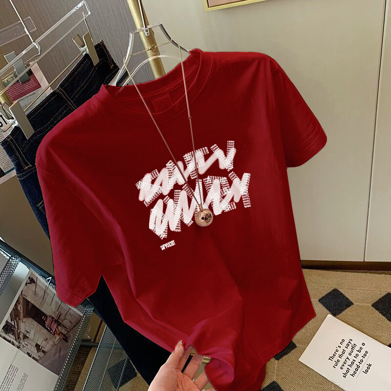 2025夏季设计感小众正肩红色纯棉短袖t恤女宽松百搭半袖体恤上衣