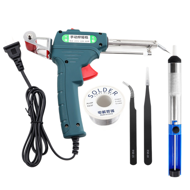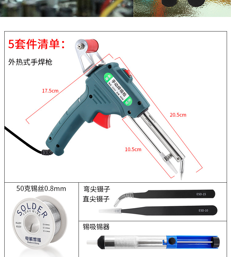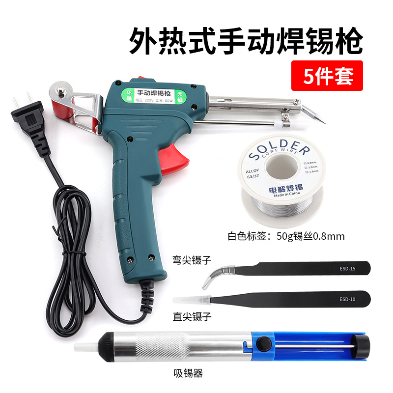 - 【墨绿色】中规220V外热式焊锡枪+半铝吸锡器+尖嘴镊子+弯嘴镊子+50g锡丝(白色标签)