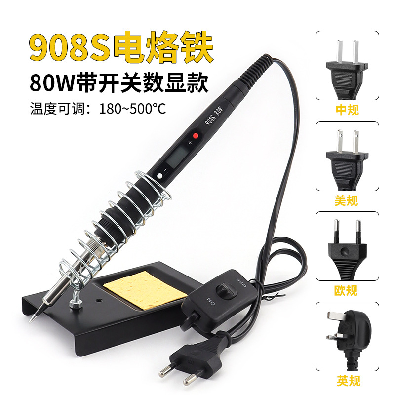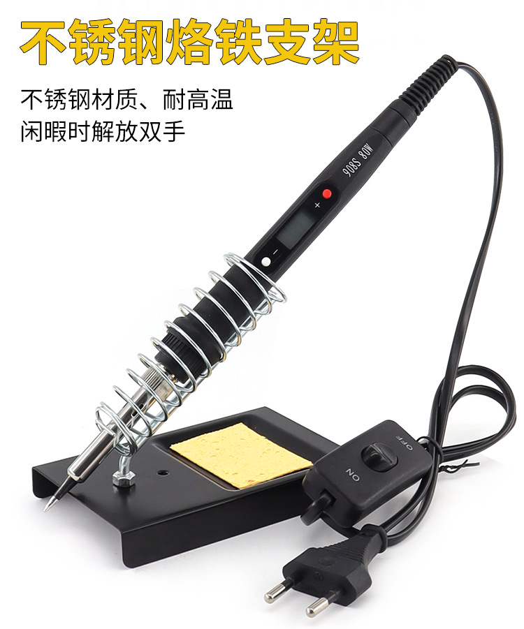 - 【欧规带开关11件套】908S电烙铁+5支烙铁头+海绵+笔筒焊丝+弯镊+蓝吸锡器+Y烙铁架